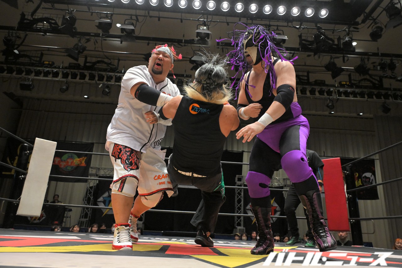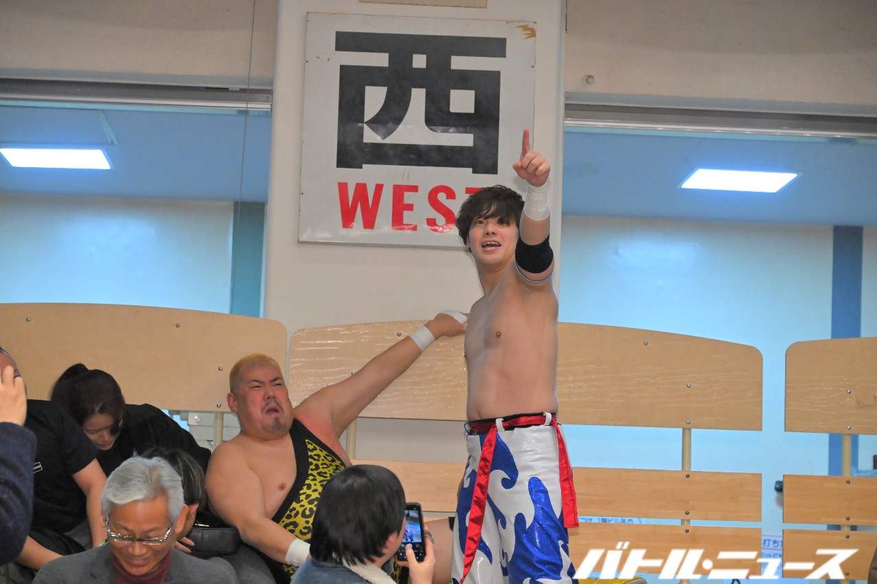 代わる神野がパンプハンドル式のアバランシュ・ホールドから串刺しラリアットを狙うが、宗達がエプロンに逃れてかわし、ダイビング・クロスボディ。渡瀬にタッチ。