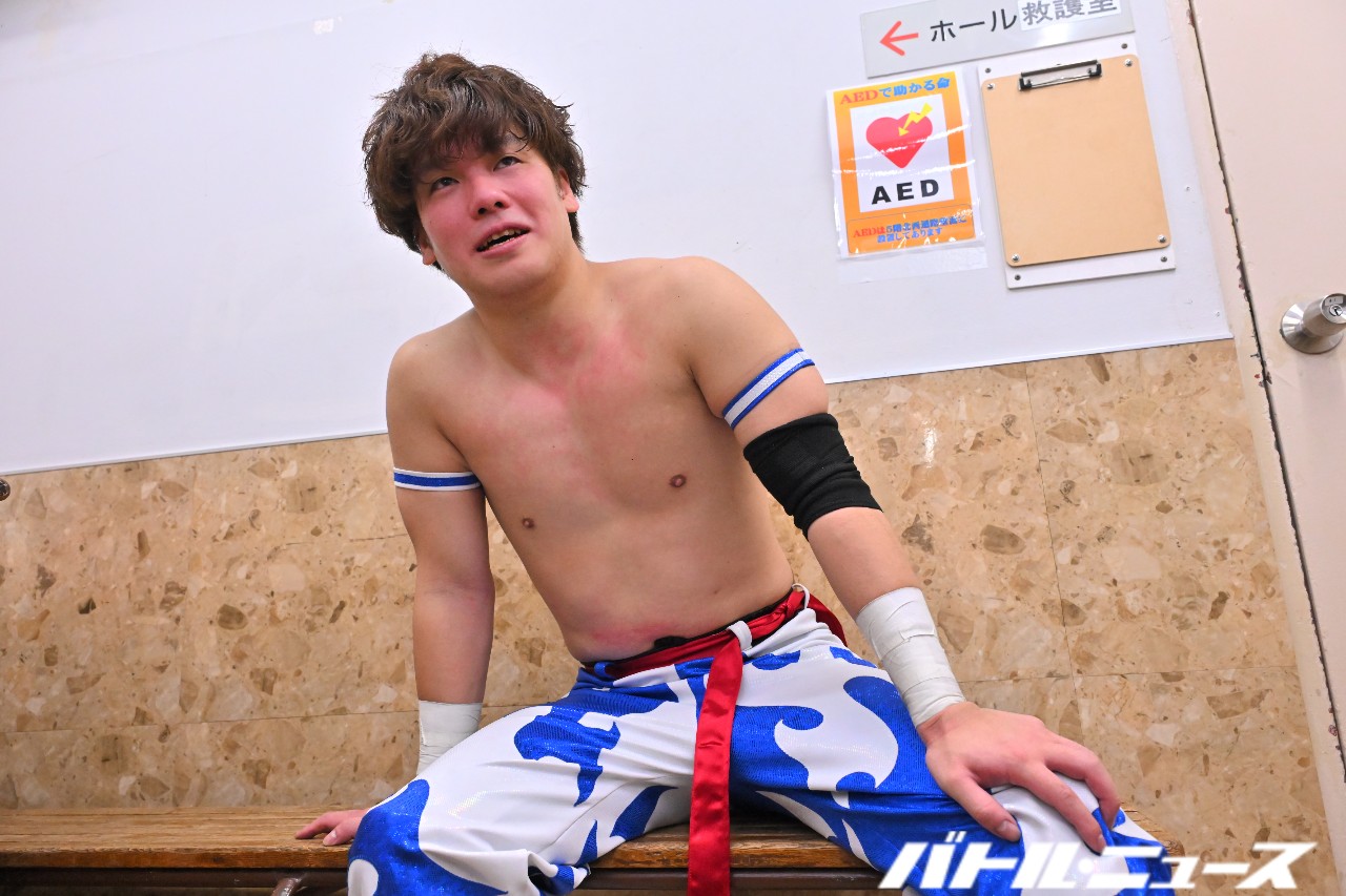 「……悔しい。悔しいね。年間最大のTTTのビッグマッチ、後楽園ホール!今日勝って2026年、僕が引っ張りたかった。ガッツさん、知ってたけど強いです。強すぎる!強すぎるけど、全然諦めてないから。まだ2026年、始まったばっかり!必ず腰にベルトを巻いて、TTTを引っ張って、もっと上にTTTを持っていきます!みんな、TTTを見てください!お願いします!ありがとうございましたッ!」