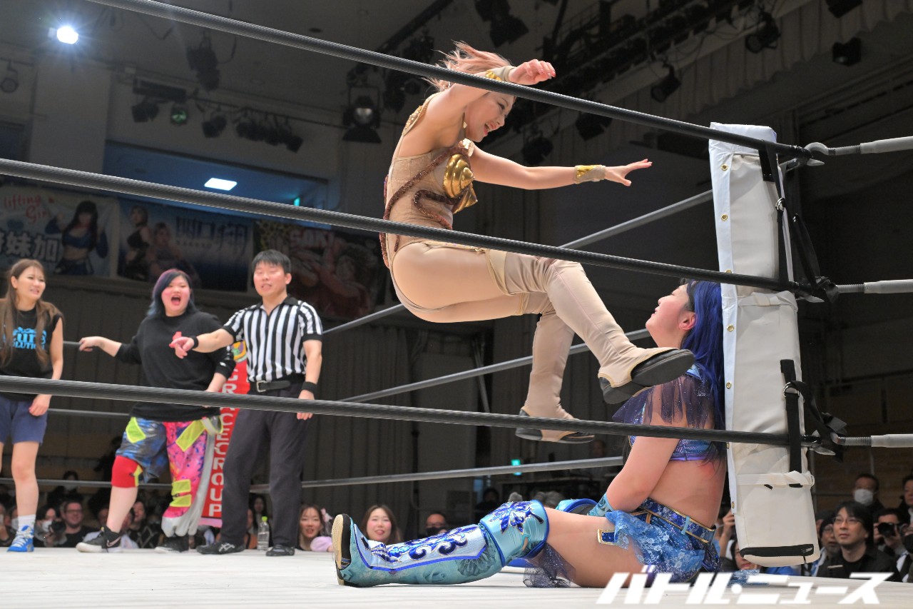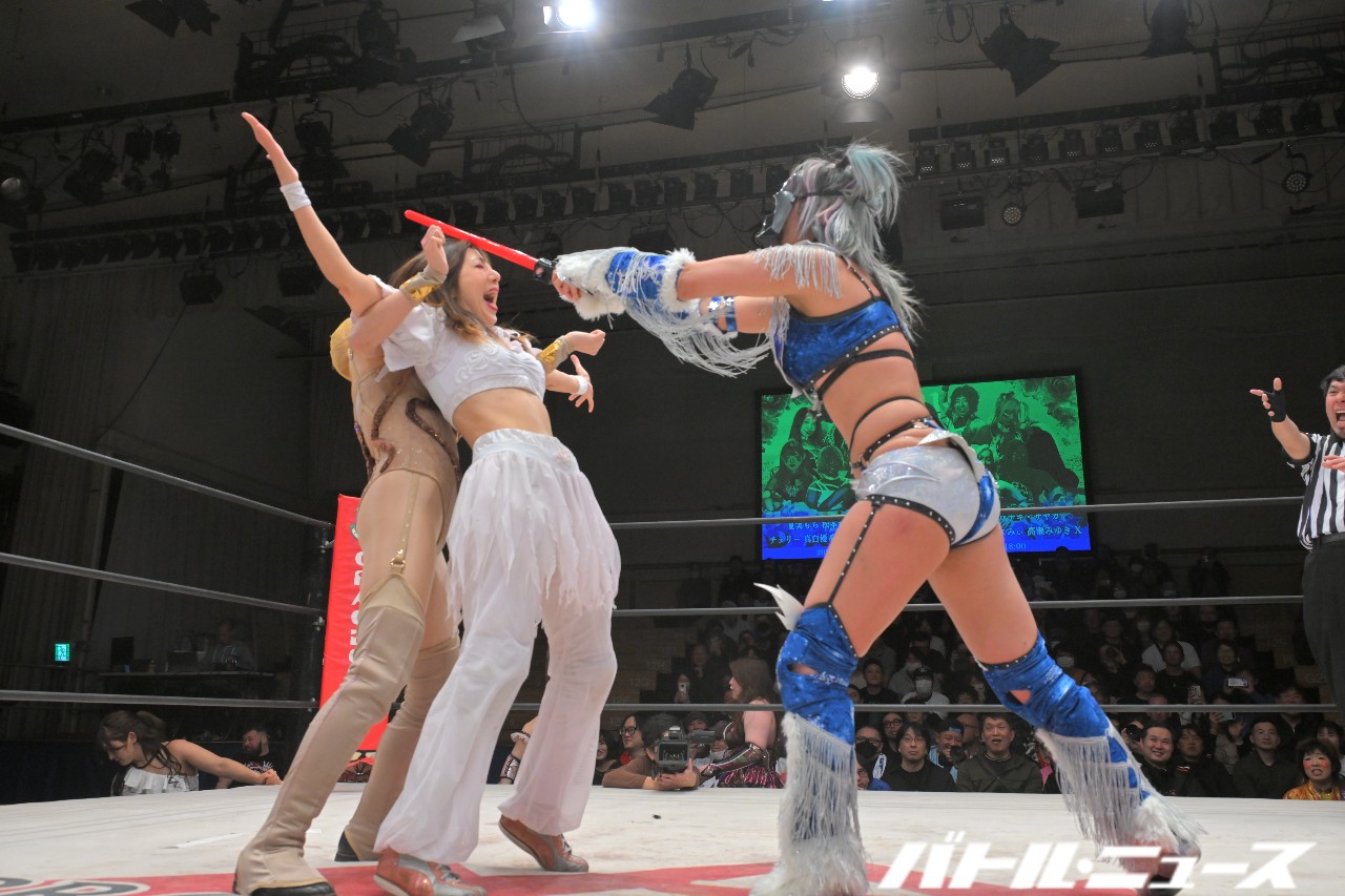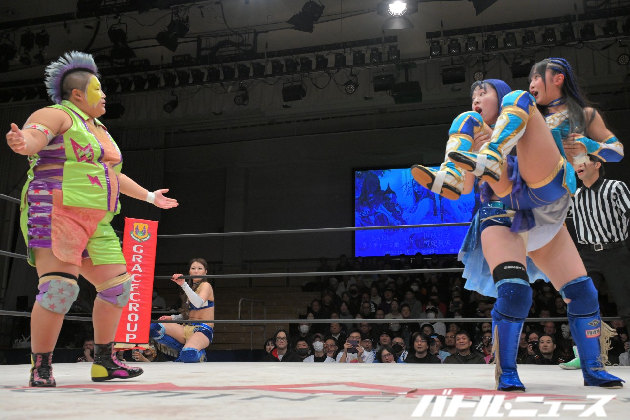 SAKIが美蘭を世羅に振り「お前が持って。絶対持っとけよ」と指示。SAKIがエルボーを狙うと美蘭が避けるが、SAKIは構わずエルボーを打ち込みエルボー合戦へ。世羅がエルボー連打も、SAKIがボディブローからロープに飛んでビッグブーツ。キャッチした世羅が足へのナックル連打から、美蘭がダイビングクロスボディで2人まとめて倒す。