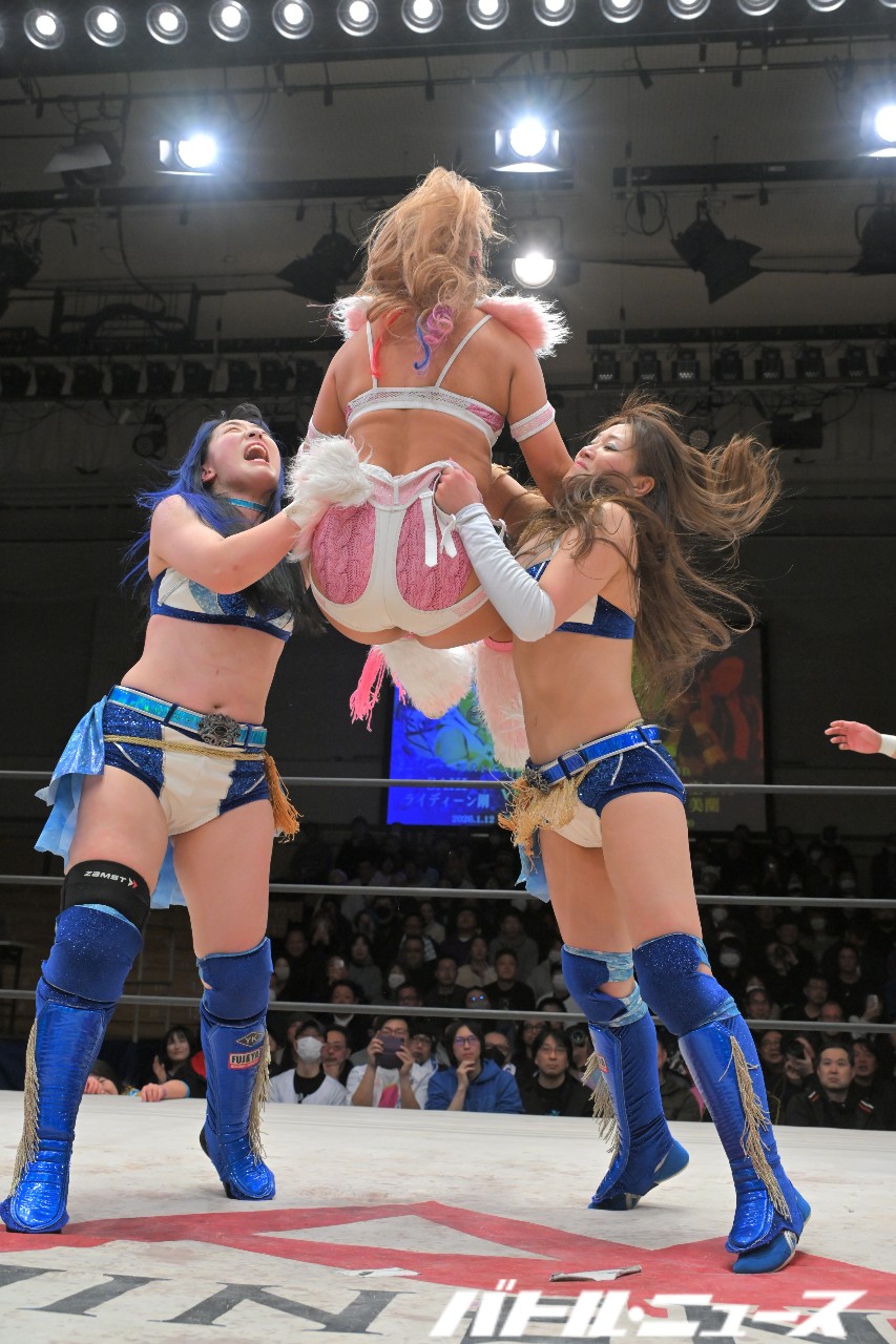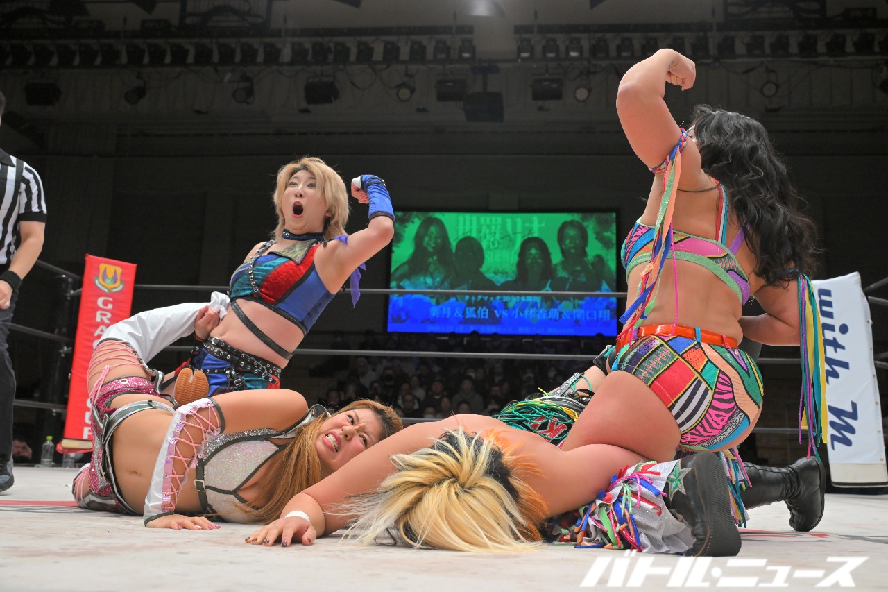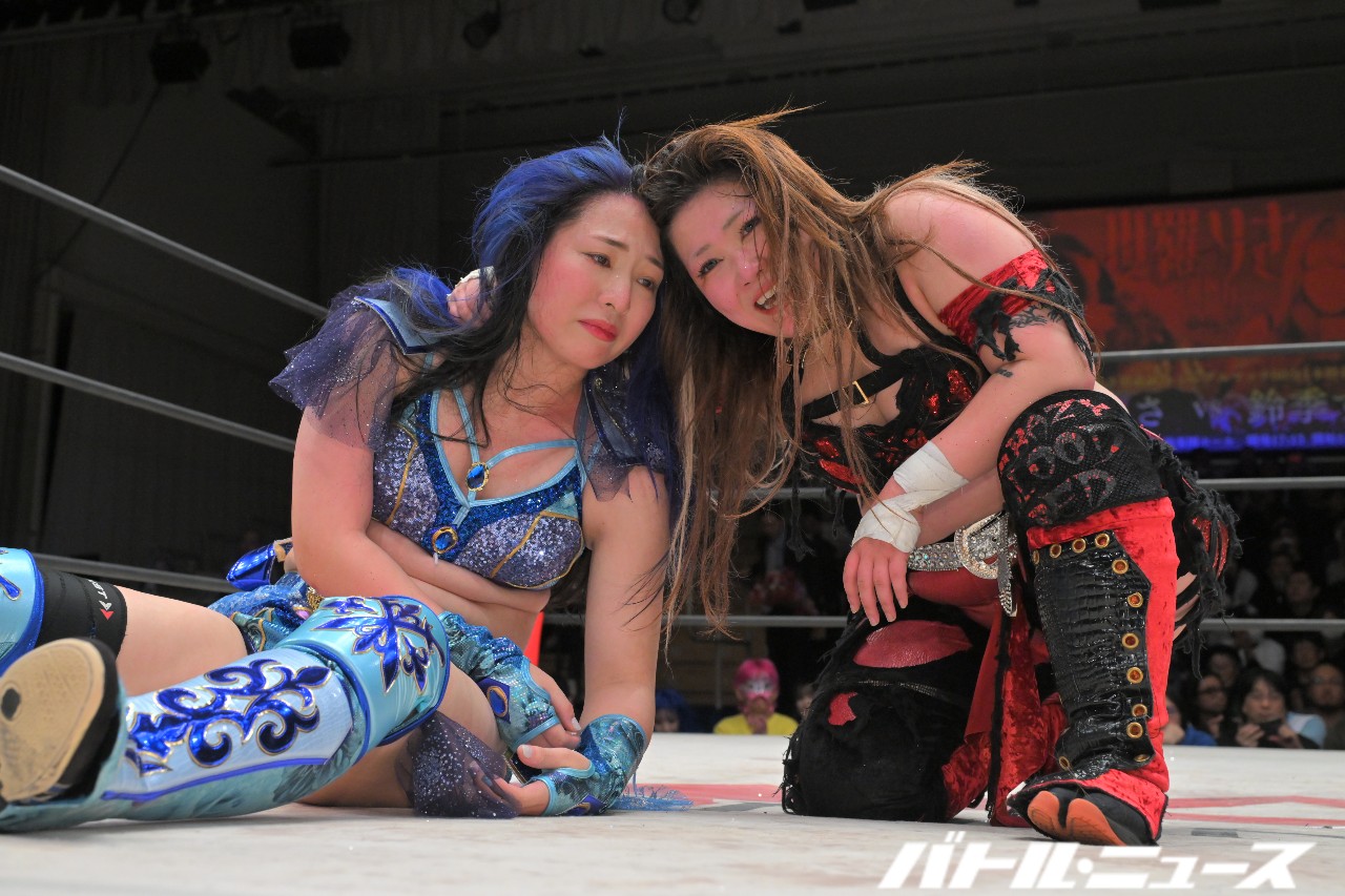 SAKIが美蘭を世羅に振り「お前が持って。絶対持っとけよ」と指示。SAKIがエルボーを狙うと美蘭が避けるが、SAKIは構わずエルボーを打ち込みエルボー合戦へ。世羅がエルボー連打も、SAKIがボディブローからロープに飛んでビッグブーツ。キャッチした世羅が足へのナックル連打から、美蘭がダイビングクロスボディで2人まとめて倒す。