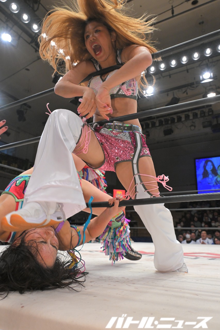 HANAKOはJPコースターを狙うが、耐えたくるみがビッグブーツを弾いてジャーマンスープレックスホールドも2。