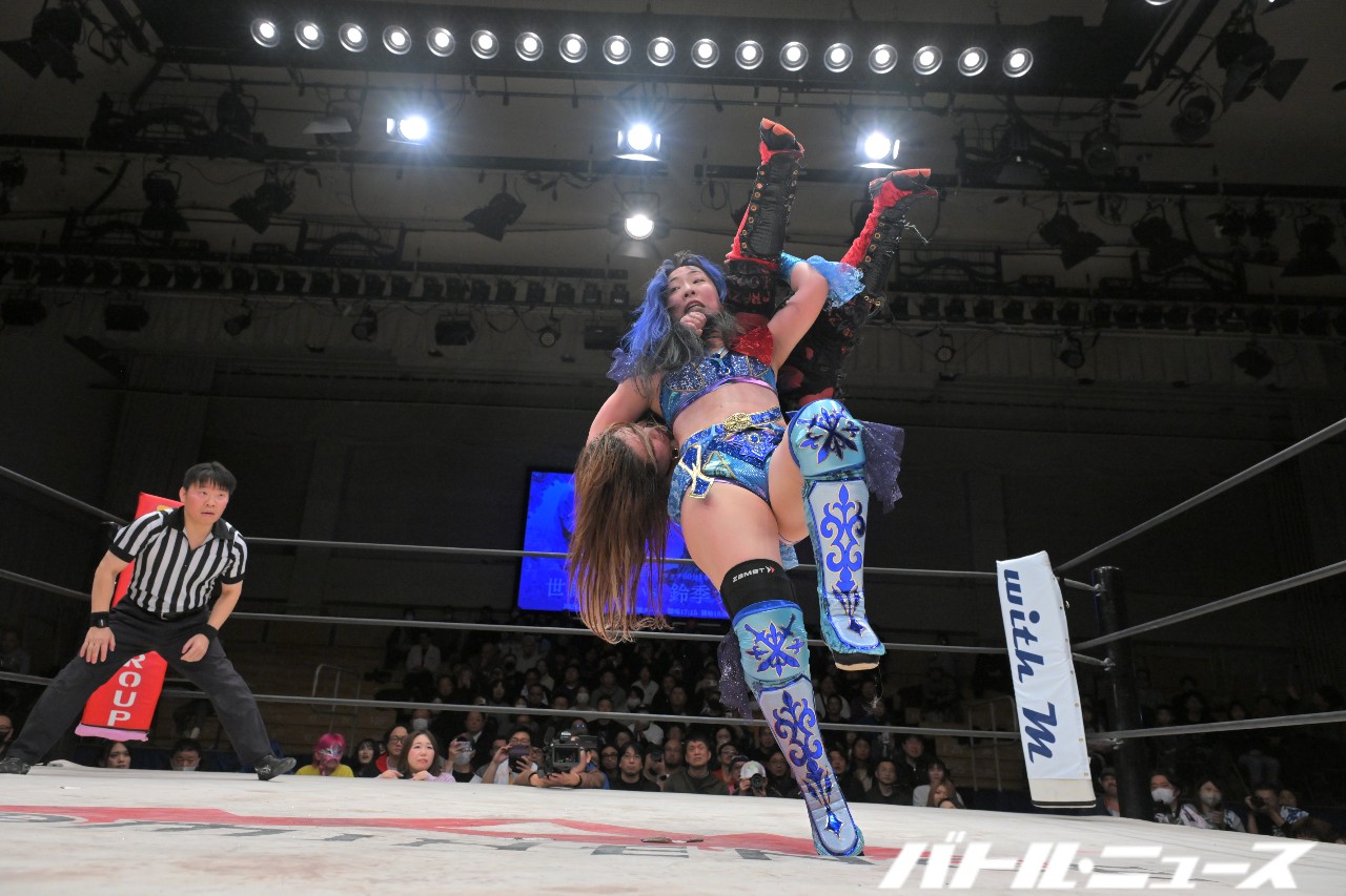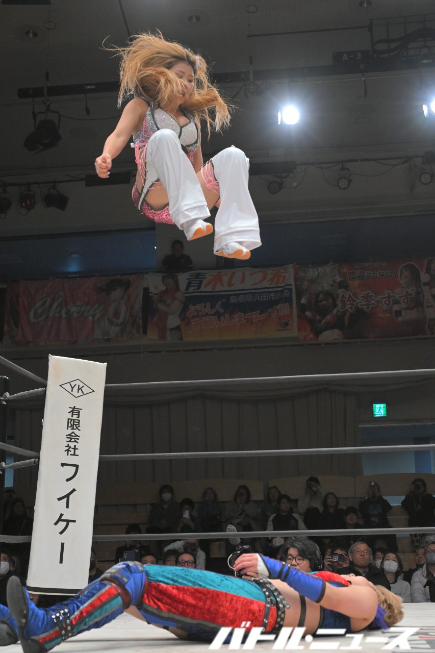 世羅コールを聞いて立ち上がった世羅がエルボー連打。ロープに飛ぼうとするが、すずが髪を掴んで動きをとめてエルボー。さらにロープに飛ぶが、世羅はカウンターのエアーズロック。さらにロープに飛ぶも、すずがエルボーで迎撃する。