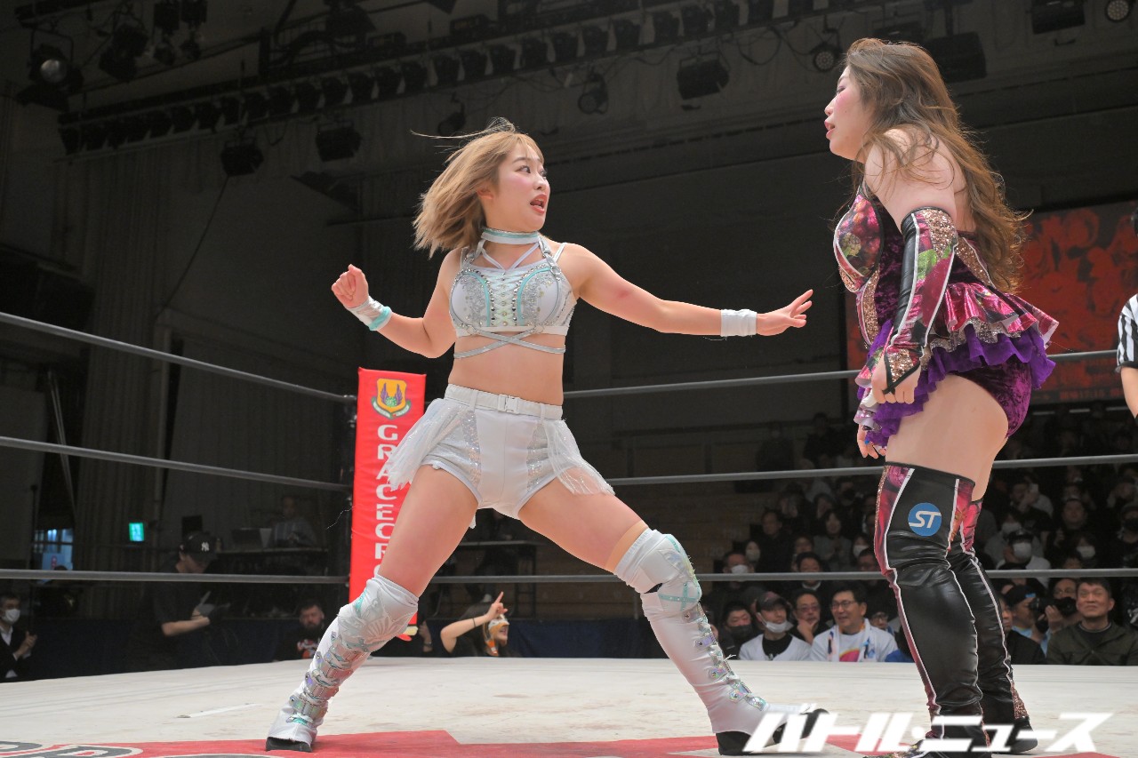 鋼が世羅を担ぐも、暴れて着地した世羅がエルボー。エルボーの打ち合いは鋼が制し、世羅が立ち上がってエルボー連打からロープに飛ぶが、鋼はニールキックで迎撃。フォールもちえがカット。