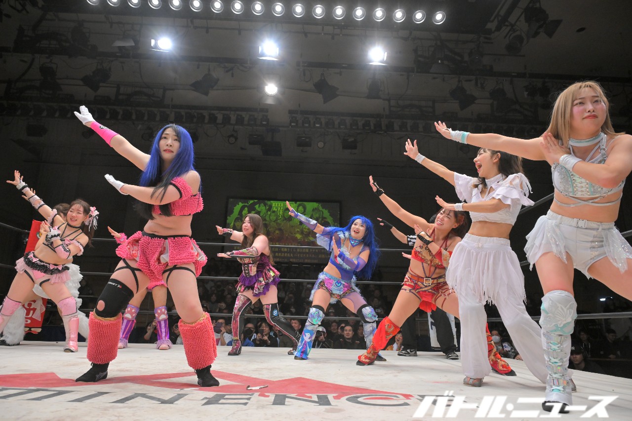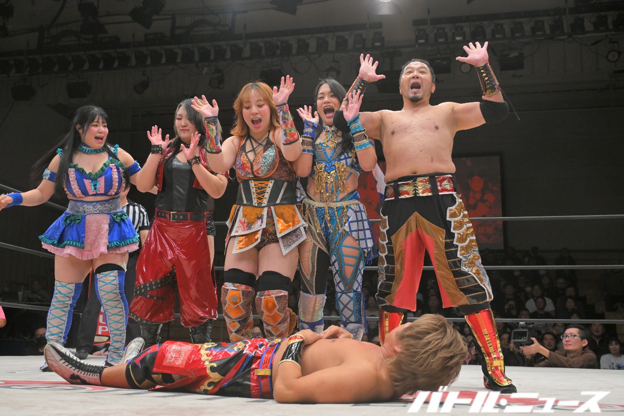 網倉は走り込むが、日高がガットショット。キャッチした網倉が足へのナックル連打。櫻井は青木の足へのナックル連打。佐々木は妹加の頭にナックル連打。「ぐー」と叫んで網倉が日高にボディブローから、日高のボディを3人で踏みつけて乗り越えるトレイン攻撃。妹加と青木も混ざって5人で日高を踏みつけてき、最後は5人でワープレスから網倉が「世羅さん大好きー」と叫ぶ。