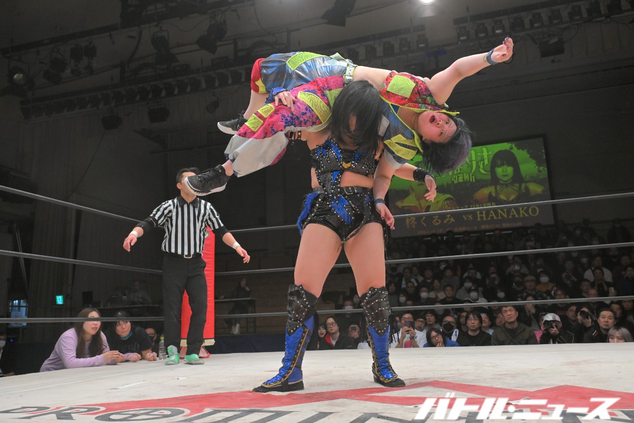 HANAKOは白鷺で捕らえるも、くるみは振り回して抜けてバックを取る。だがHANAKOは耐えるとエルボーからロープに飛ぶが、くるみはブラックホールスラムで迎撃しフォールも2。