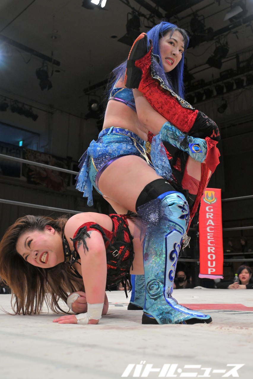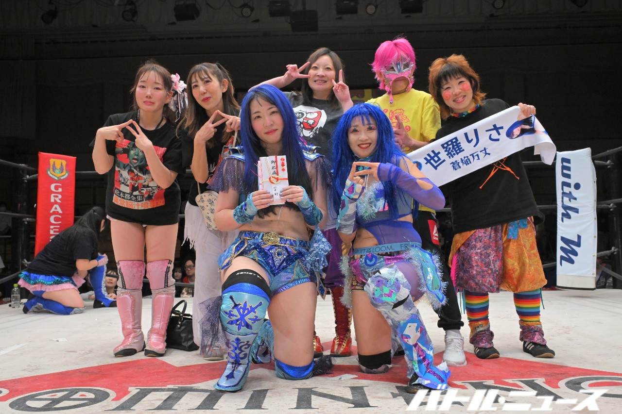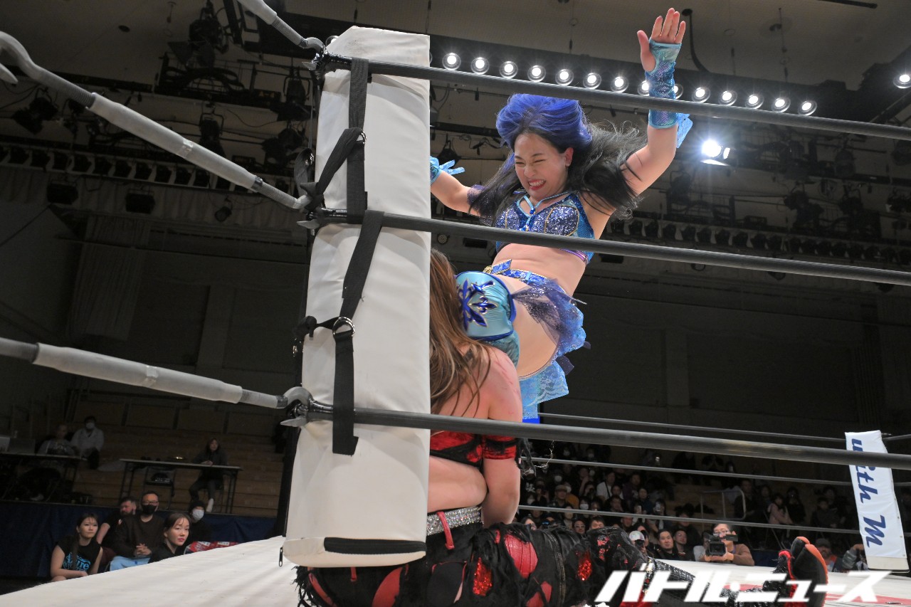 世羅から蒼焔を継いだちえと、世羅とタッグユニット“ブルーオーキッド”を組んでいた美蘭のタッグと、JWPやアイスリボンなどで戦ってきた世羅と2012年デビュー同期の鋼&SAKIのタッグが、最後のアジュール・レボリューションと対戦。
