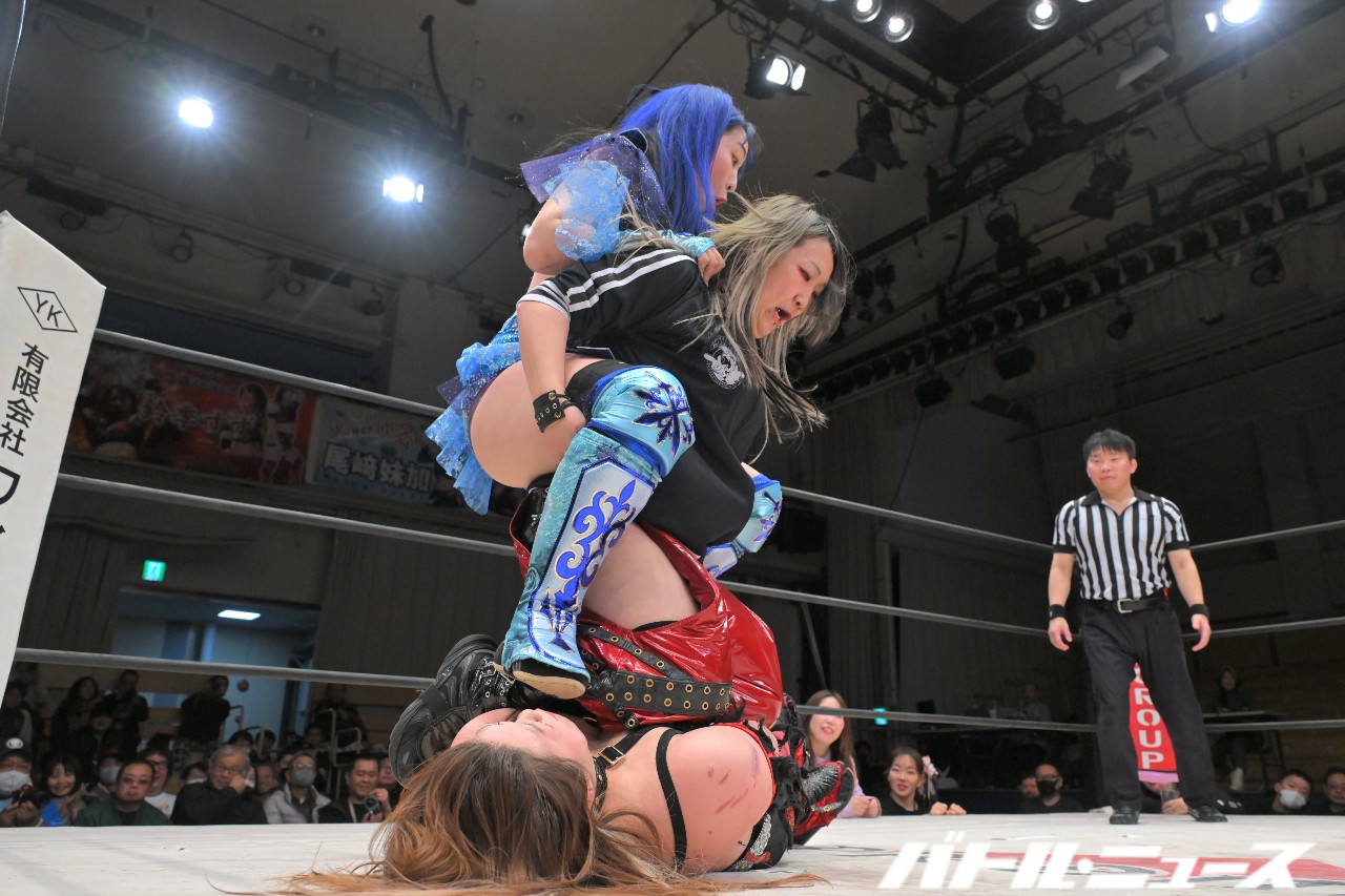 世羅がSAKIを担ぎ、雪妃のヒザに投げ捨てて雪妃が二ーアッパー。さらにアジュレボのダブルパワーボムからフォールもちえがカット。