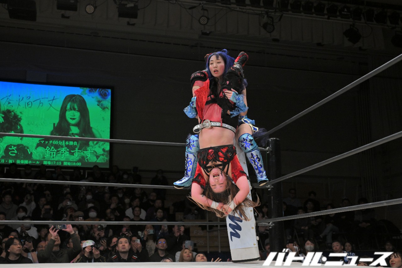 膝立ちでエルボーの打ち合いから、世羅が髪を掴んでエルボー連打。頭にストンピング連打から、コーナーに登るがすずがビンタから正面に登りエルボー連打から雪崩式フランケンで投げ捨て、すぐに立ち上がった世羅が走り込むもすずはカウンターのテキーラショットも2。