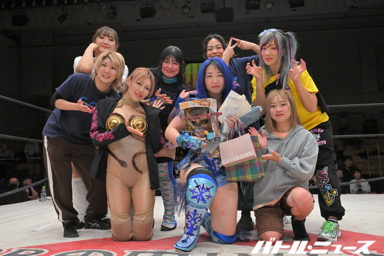 まずは出場したフリー選手たち(夏すみれ、VENY、小林香萌、関口翔、ウナギ・サヤカ、尾崎妹加、真白優希)からプレゼントが贈られる。