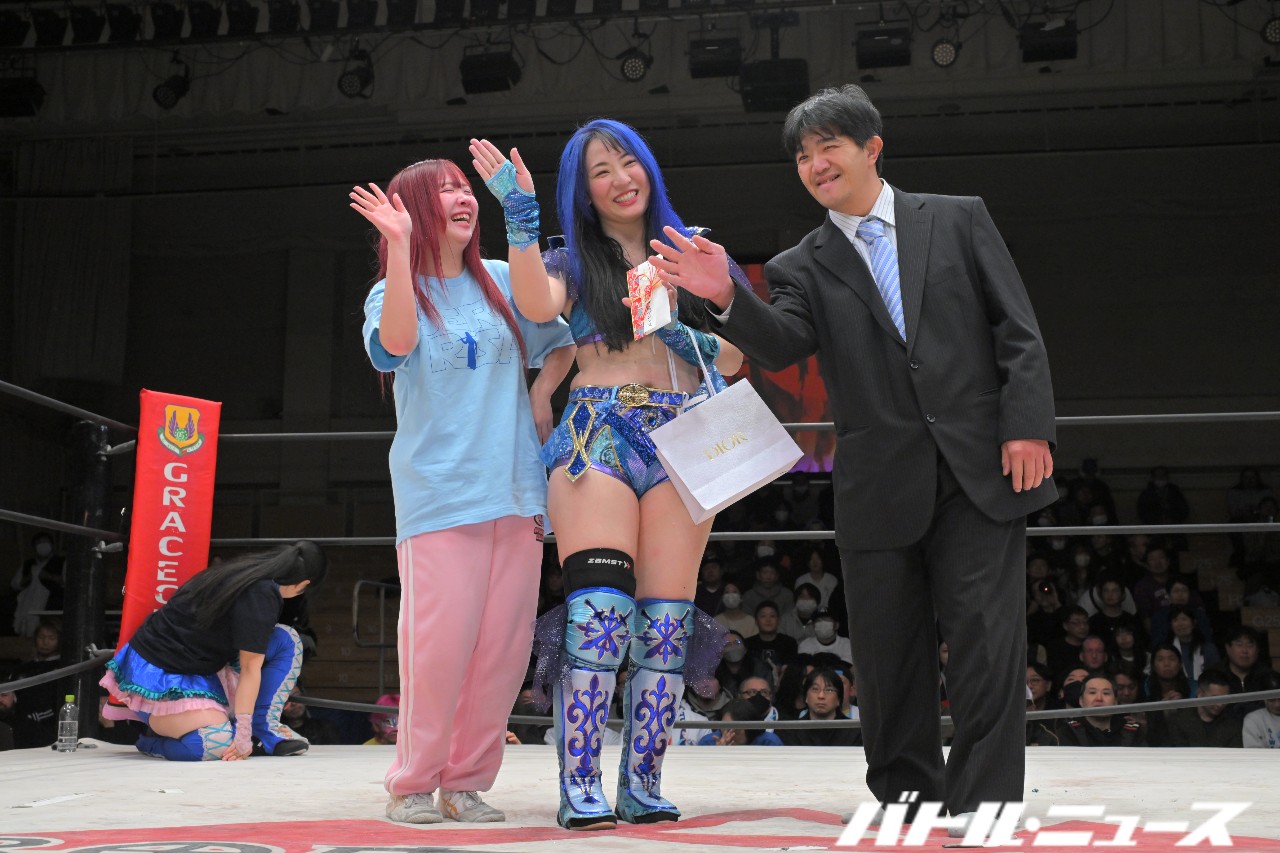 スクリーンにエンドロールが流され、引退の10カウントゴング。最後の選手コールとともにリング上を埋め尽くす青の紙テープが舞い、最後は世羅がくるみ&もち&すず&雪妃&SAKIが組んだ騎馬に乗って会場を1周。世羅は笑顔で手を振りながら選手として最後の退場を終えた。
