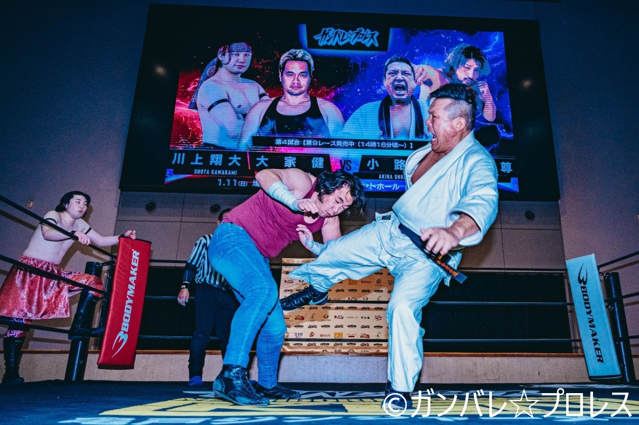 レースの合間に全5試合が行われ、第4試合には“ミスターPRIDE”小路晃が参戦。元キック王者・前口太尊と格闘タッグを結成し、大家健&川上翔大と対戦。小路はいきなり大家にキムラロックを決め、ローキックを連打。前口は大家にミドルキック連打。小路は川上にワキ固めを決めるもカット。ならばと小路は川上に一本背負い。STOから腕十字をガッチリ決めてタップを奪った。