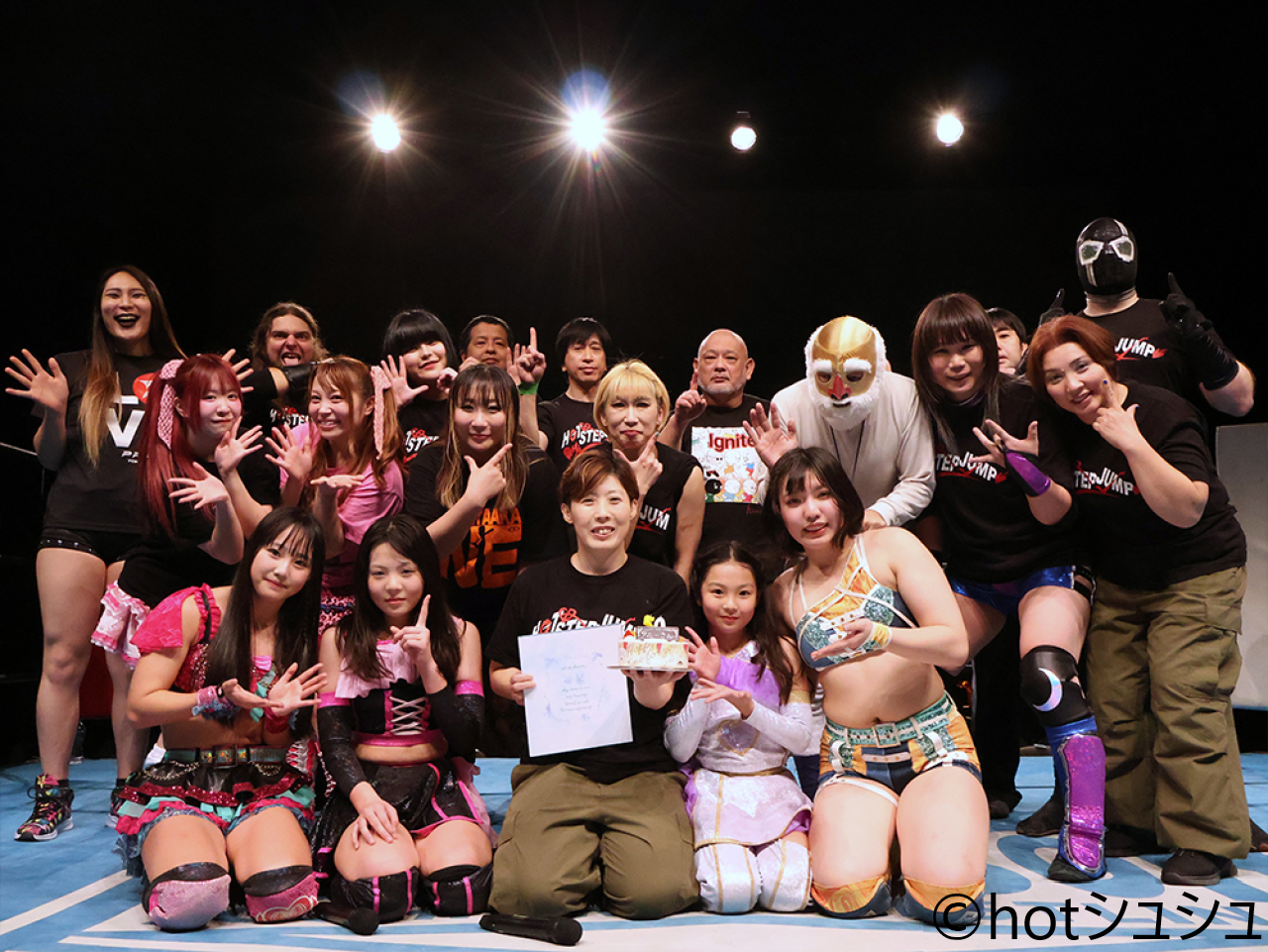 ※ここでいつもはフィナーレだが、リング上にバースデーケーキが運ばれ、1月7日が50歳の誕生日だったタニーを全員で祝福。ケーキと寄せ書き色紙をもらったタニーは「本当にびっくりしました。サプライズ上手になったなって思って。50歳になりましたー!でもまだまだhotシュシュを今年もよろしくお願いします。」と語り、最後はタニーの合図で全員で「ホット!ステップ!ジャンプ!」でジャンプ。北沢大会を締めた。
