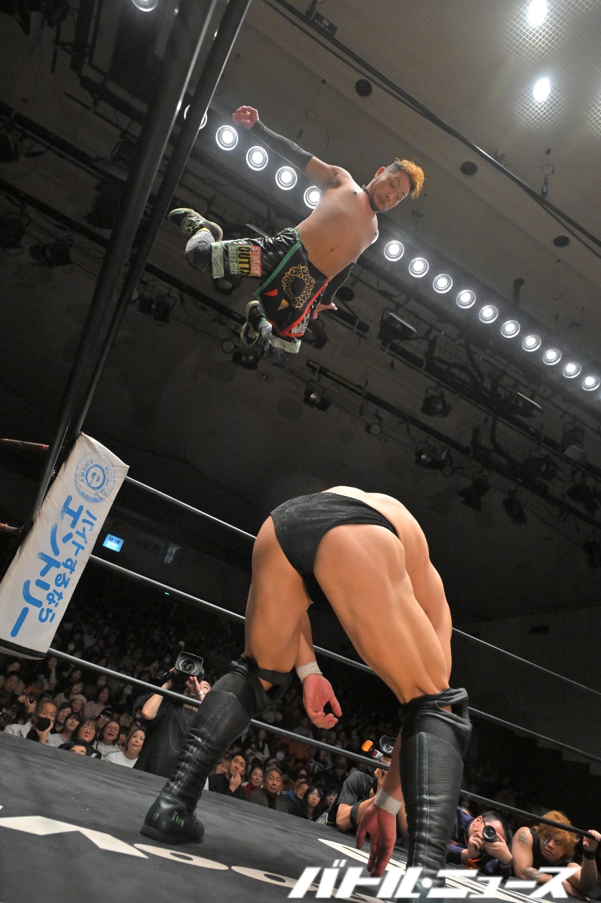 場外でのパワーBOSS(※パワーボム)を決めるなど大暴れした清水が餅つき式のシュミット式バックブリーカー連発からのブロックバスターとパワーファイト全開で攻め込んでいくが、Kzyも得意のエルボースマッシュを軸に突っ張っていき、クモガラミで弱らせてからBEAT-BOM。さらに必殺のKZ.time(※フロッグ・スプラッシュ)を狙ってコーナーに上るが、清水は雪崩式バックフリップで切り返す。