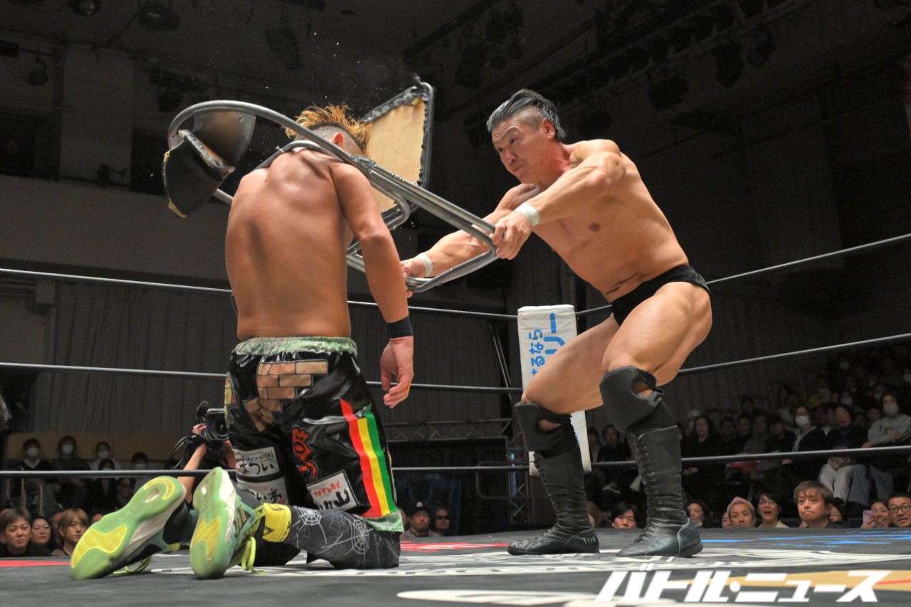 しかし、場外からKAIがパイプ椅子でぶっ叩いてこれを妨害。清水もイスを手にとってKzyの頭をぶち抜き、パワーBOSSから砲丸投げスラム2連発で3カウントを奪った。
