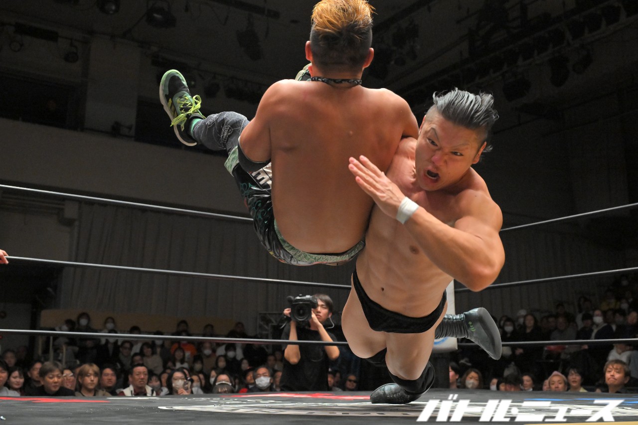 後頭部をコーナーマットに打ち付けて朦朧とするKzyに対し、清水はパワーBOSSからラリアット。さらに砲丸投げスラムを狙うが、KzyはこれをダブルアームDDTで切り返し、ランニング・エルボースマッシュを狙ってロープに飛ぶ。