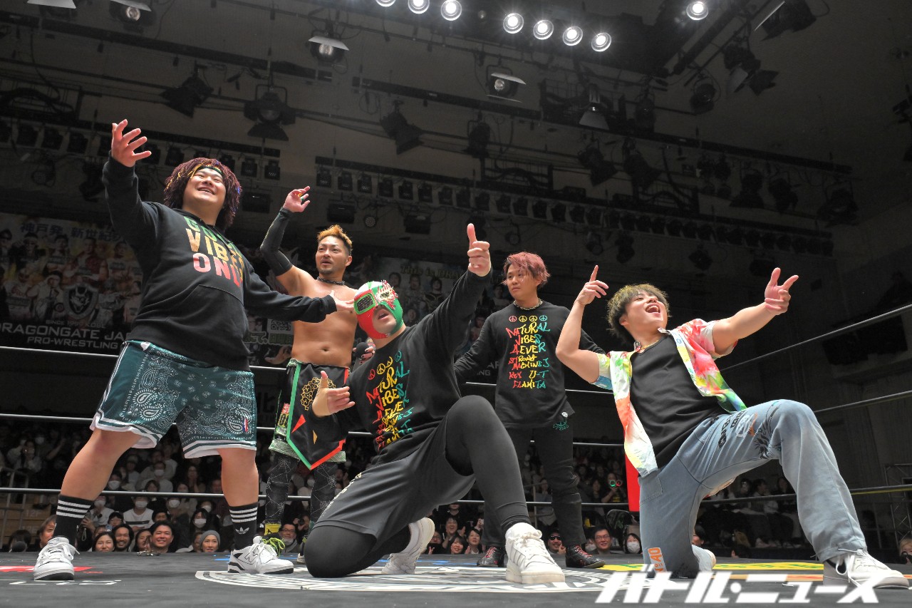 ようやくマイクを取ったKzyが「もう蚊帳の外ってか?俺たちがどんな思いでバイブスを守ってきたか……。気付けばDRAGON GATEで一番長いユニットになった。色んな人が卒業したし、裏切りにもあったけど今回が一番堪えたわ。結局アイツを止めることが出来なかった。ダメージもあって、続けていく自信が、ちょっと……」と珍しく弱音を吐いて黙り込んでしまう。