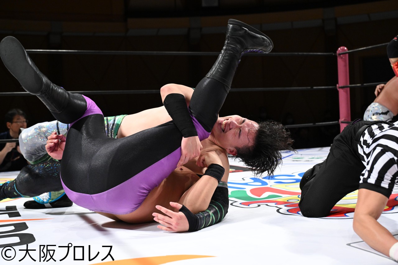 第2試合は先ほどと打って変わって大阪プロレスらしい楽しい試合。こちらは大阪名物世界一戦線で戦う者たちが集っただけに激しい主導権争いを繰り広げる。