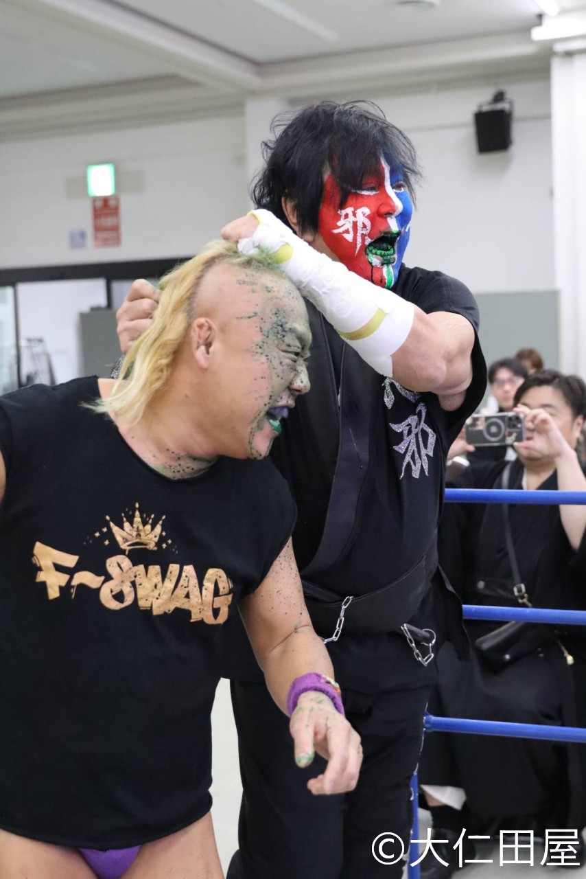 ニタは佐野に毒霧を浴びせ、セコンドについた雷神矢口のアシストにより鎌を手にすると、リング上で奇怪なダンスをしながら佐野の脳天に鎌を振り下ろし、挙げ句の果てには、レフェリーを場外へ突き落とす始末。「反則負けだろ!おい!」佐野の抗議の声が虚しく響く中、突然王道プロレスに目覚めたのかニ、タは寧々に2連続でダブルアームスープレックスをきめる。最後はデビルが開本を捕らえ意表を突いた火炎攻撃を浴びせ、怯んだ開本にすかさずニタがネックブリーカードロップ、そしてネグロがフライングボディプレスを畳みかけ、タッグ初めてとは思えない好連携でスリーカウントをダッシュした。