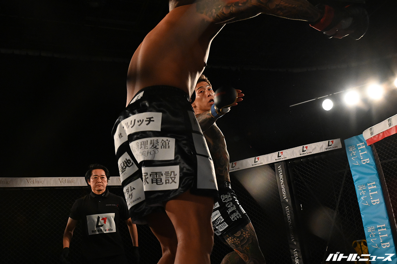 試合が始まるなり富永が飛び蹴りを放つが、避けた安藤が右ハイ。ガードした富永がミドルからラッシュを仕掛け、もつれてケージ際のためブレイク。