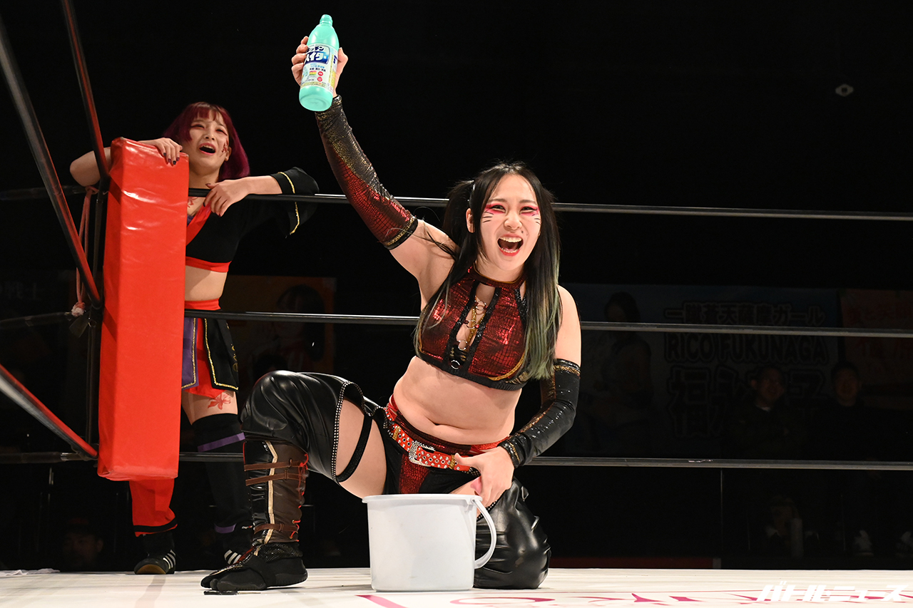 夏葵はロープに飛んでスライディングニー。さらにロープに飛ぶが、ゆきなはハイキックで迎撃し、コーナーに振ると莉子が走り込み串刺しドロップキック。ゆきなも串刺しヒップアタックから、莉子とゆきなでサンドイッチサッカーボールキック。ゆきなは莉子にタッチ。