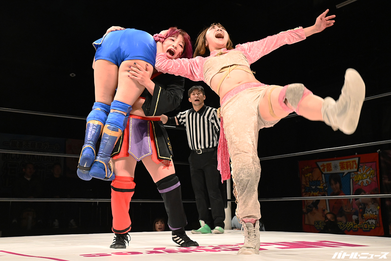 茉莉は担ぐも、暴れた絵梨沙が突き飛ばし、ドロップキックからカンガルーキックで吹っ飛ばすと、梨央が走り込むが茉莉はショルダータックルで迎撃。