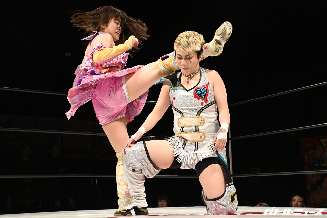 夏葵がボディスラムを狙うが、耐えた莉子が足への低空ドロップキックからフォールも2で切り返し合戦に。お互い2で離れると、莉子がスピンキックからドラゴンスープレックスを狙うが、切り返した夏葵に莉子がハイキック。夏葵は避けてジャンピングニーから走り込むが、莉子がミドルキックからボディに膝蹴り連発。さらにロープに飛ぶが、夏葵はフラップジャックで迎撃しジャックナイフも2。