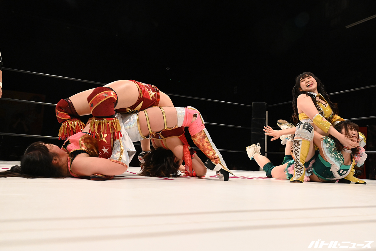 なぎさは再度オフ・ザ・リップを狙うが、莉子が背後から顔面にハイキックを叩き込んでカットすると、夏葵が莉子にドロップキック、ゆきなが夏葵にカカト落とし、なぎさがゆきなにフライングクロスダブルチョップ、莉子がなぎさにハイキック、ゆきながなぎさにニールキックからYKNT(=三角絞め)。これでなぎさがギブアップした。