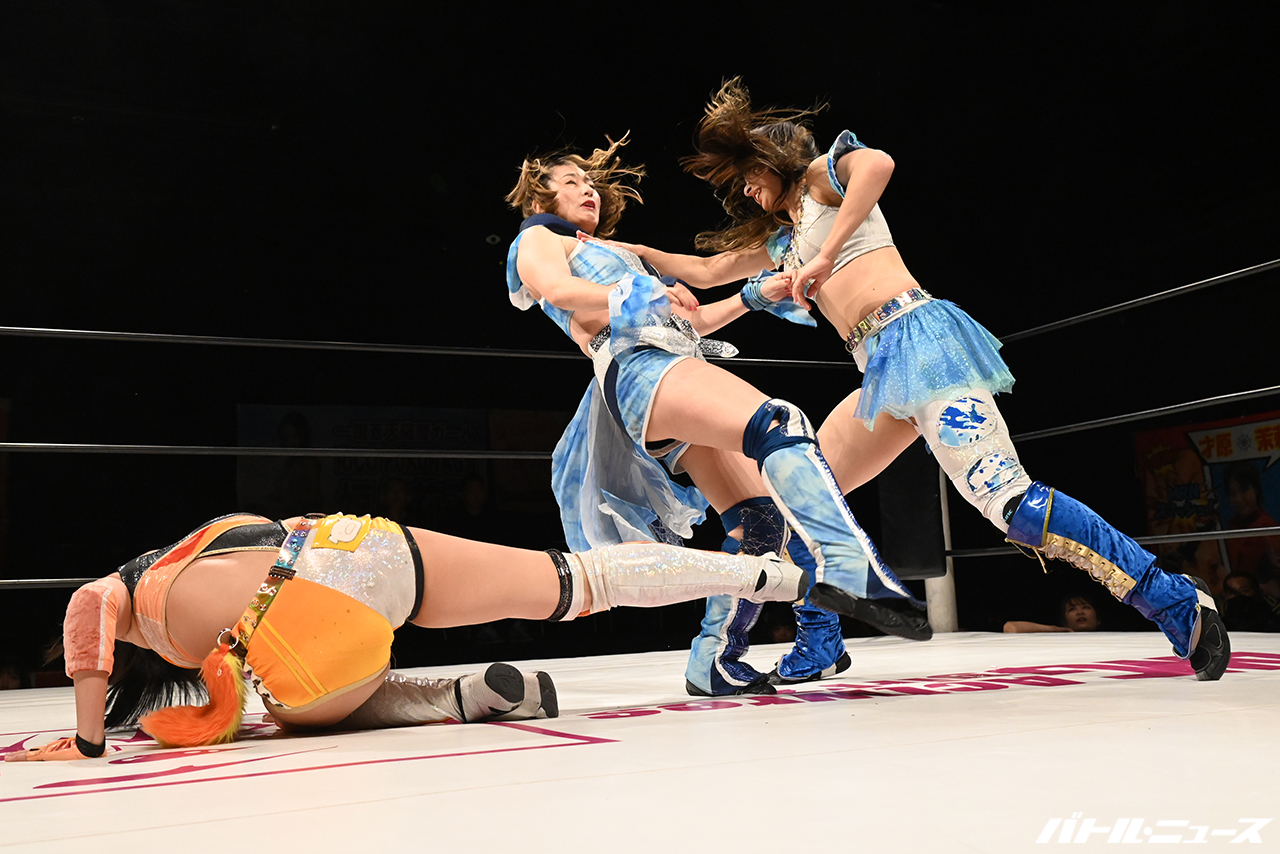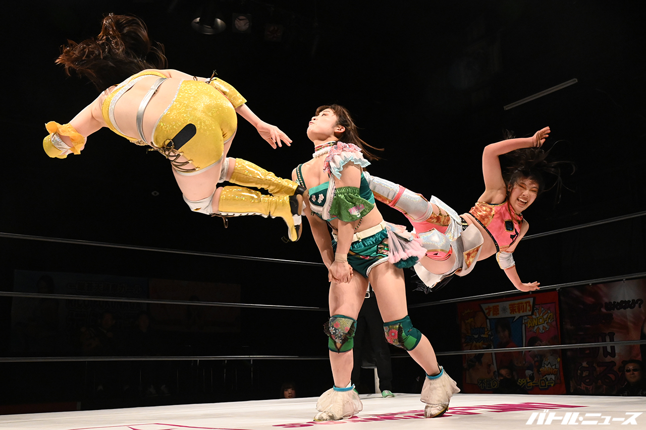 はるかは絵梨沙をボディスラムで叩きつけ、そこに梨央もボディスラムで叩き込もうとするも絵梨沙が立ち上がりカット。