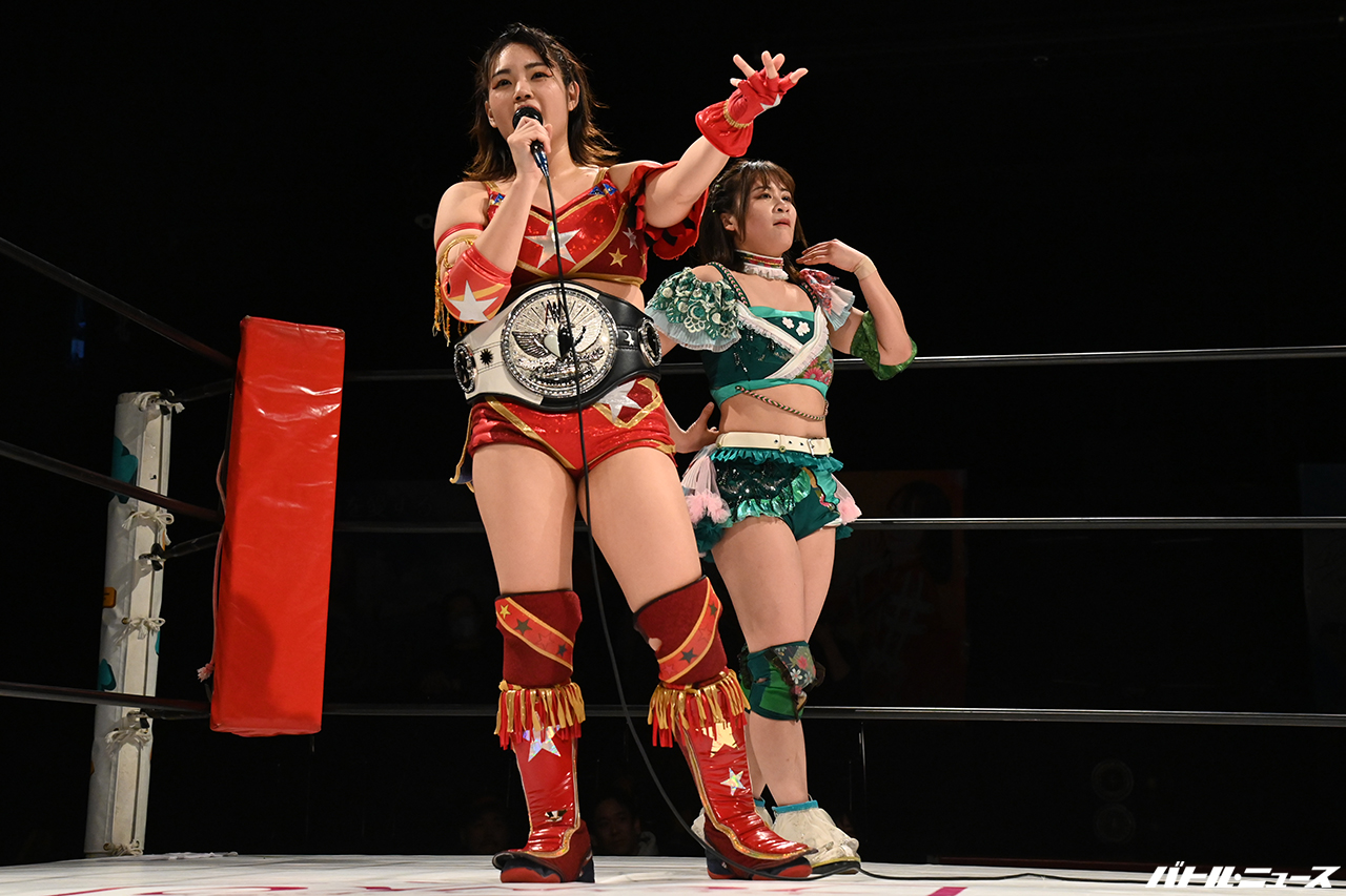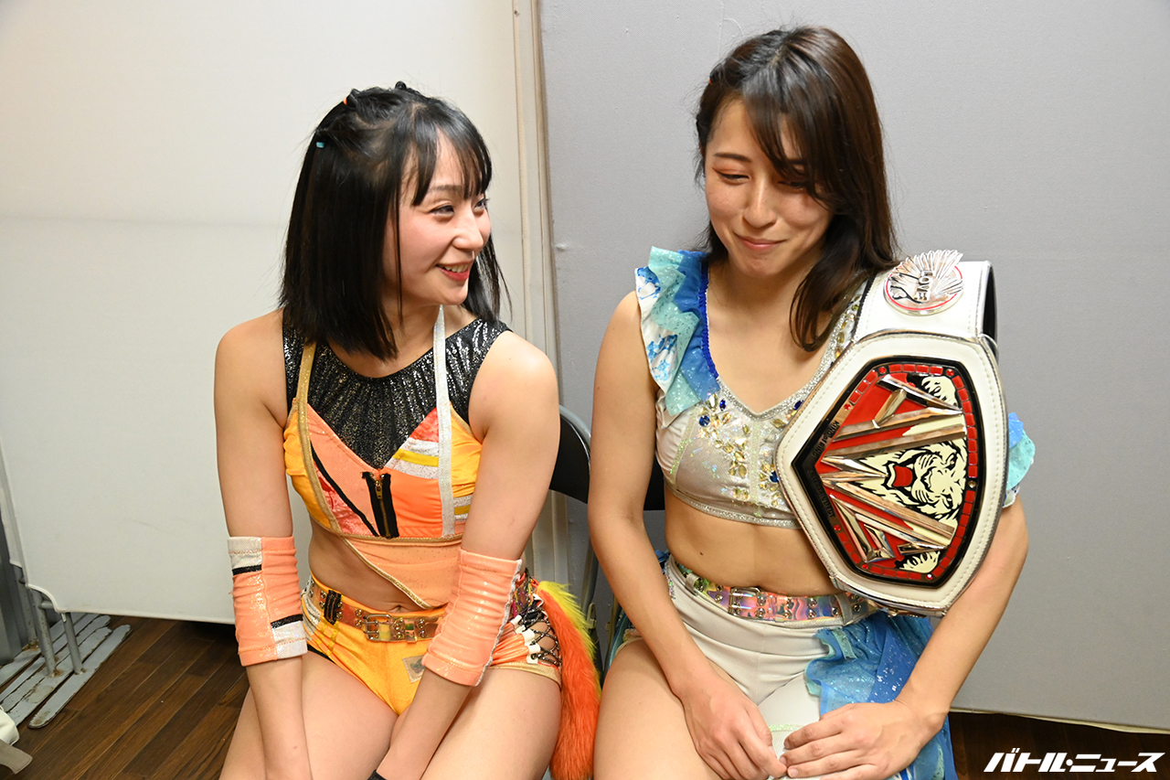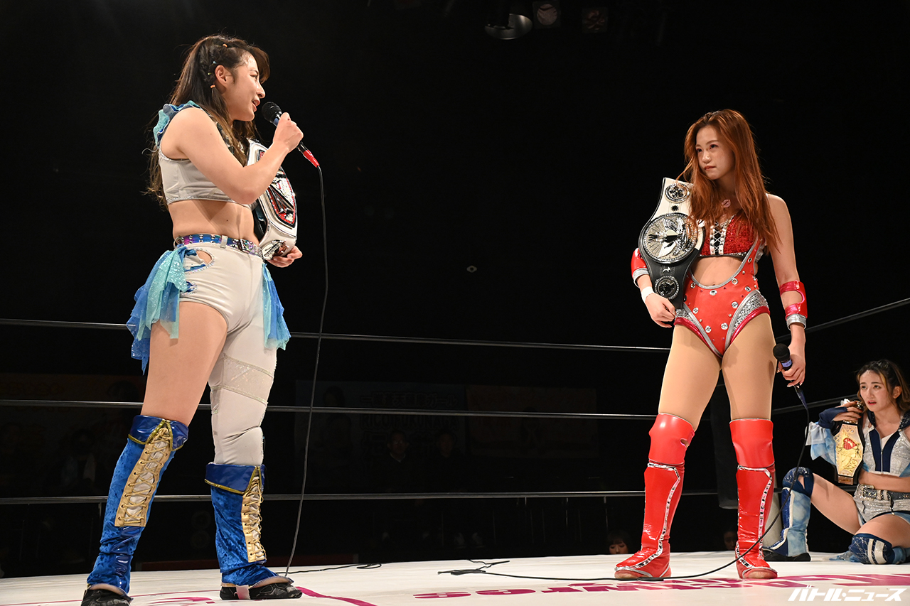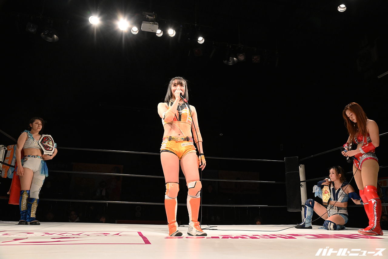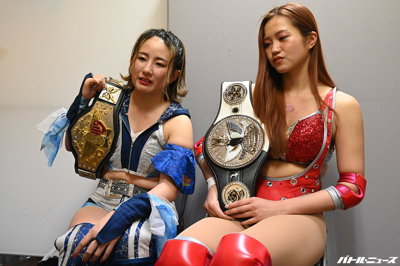 ゆきな「やっぱなんだろう、本当に天狗になってるとかではなくて、夏葵さんをフォールして後楽園で。本当に自信がついて、もちろん本当に茉莉乃さんのおかげではあるんですけど。で、今日も莉子さんのおかげもあって、なぎささんを倒せて、真夏の汐風って今までアクトレスの中だと最強のタッグってされてたお2人から取れたので、もうこのタイミングしかないんじゃないかなっていう。まあ、ずっと2冠っていうのはあったんですけど、茉莉乃さんが落としてしまってからAWGを、あったんですけど、もう今言うしかないなと思って。ちょっとチャンスというか、タイミングが来たので、言っちゃいましたね。はい。そうですね、夏葵さんも引退発表されて、うーん、悲しいですけど、なんだろう、自分が、夏葵さんがいなくなってしまった後も、背負っていくってわけじゃないけど、そういう気持ちの強さで練習して、これからのアクトレスも引っ張っていきたいなって思います。あ