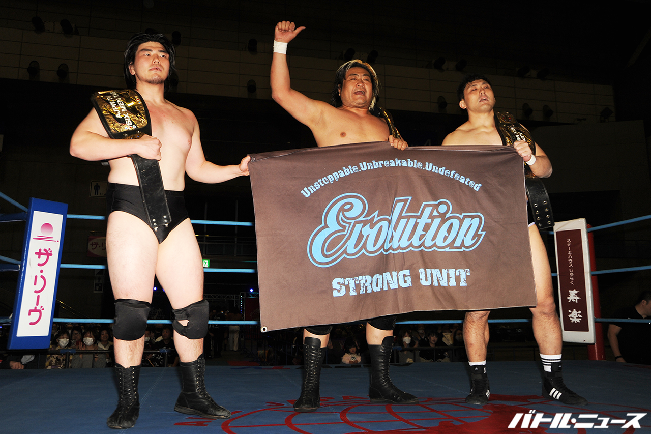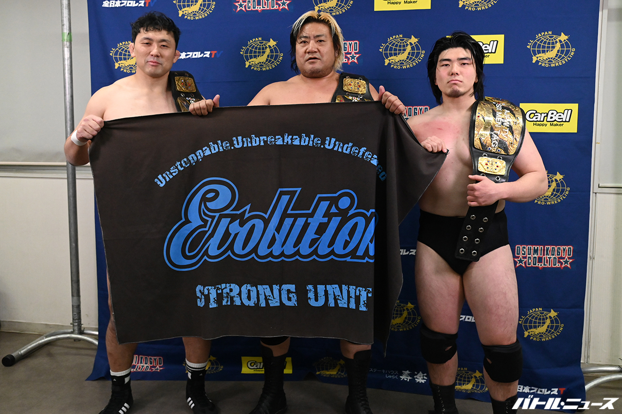 試合後には3人でEvolution(※全日本内のユニット)の旗を掲げて記念撮影に応じ、結束を深めた。
