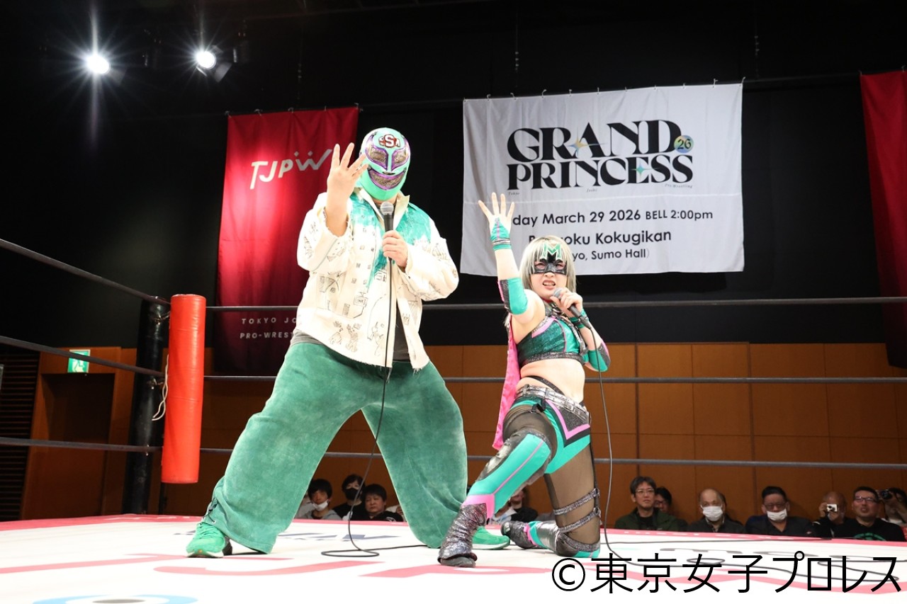 東京女子プロレスが1月25日、東京・両国KFCホールで『第6回“ふたりはプリンセス”Max Heartトーナメント』を開催した。2年ぶりに行われる両国国技館大会(3月29日)での坂崎ユカ&KONOSUKE TAKESHITAの夫婦タッグの対戦相手が、ハイパーミサヲと同大会のPR大使であるスーパー・ササダンゴ・マシンに電撃決定した。