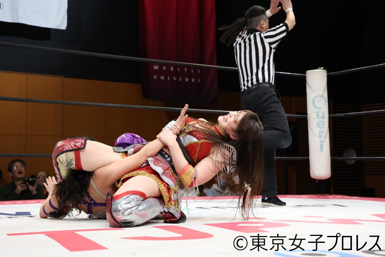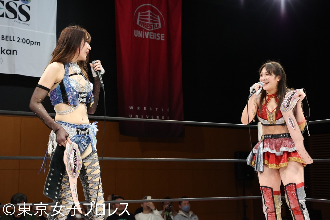 東京女子プロレスが1月25日、東京・両国KFCホールで『第6回“ふたりはプリンセス”Max Heartトーナメント』を開催した。2回戦でプリンセスタッグ王者組のOber Eats(上福ゆき&上原わかな)が荒井優希&芦田美歩の“京都タッグ”を破り、ベスト4進出を果たした。