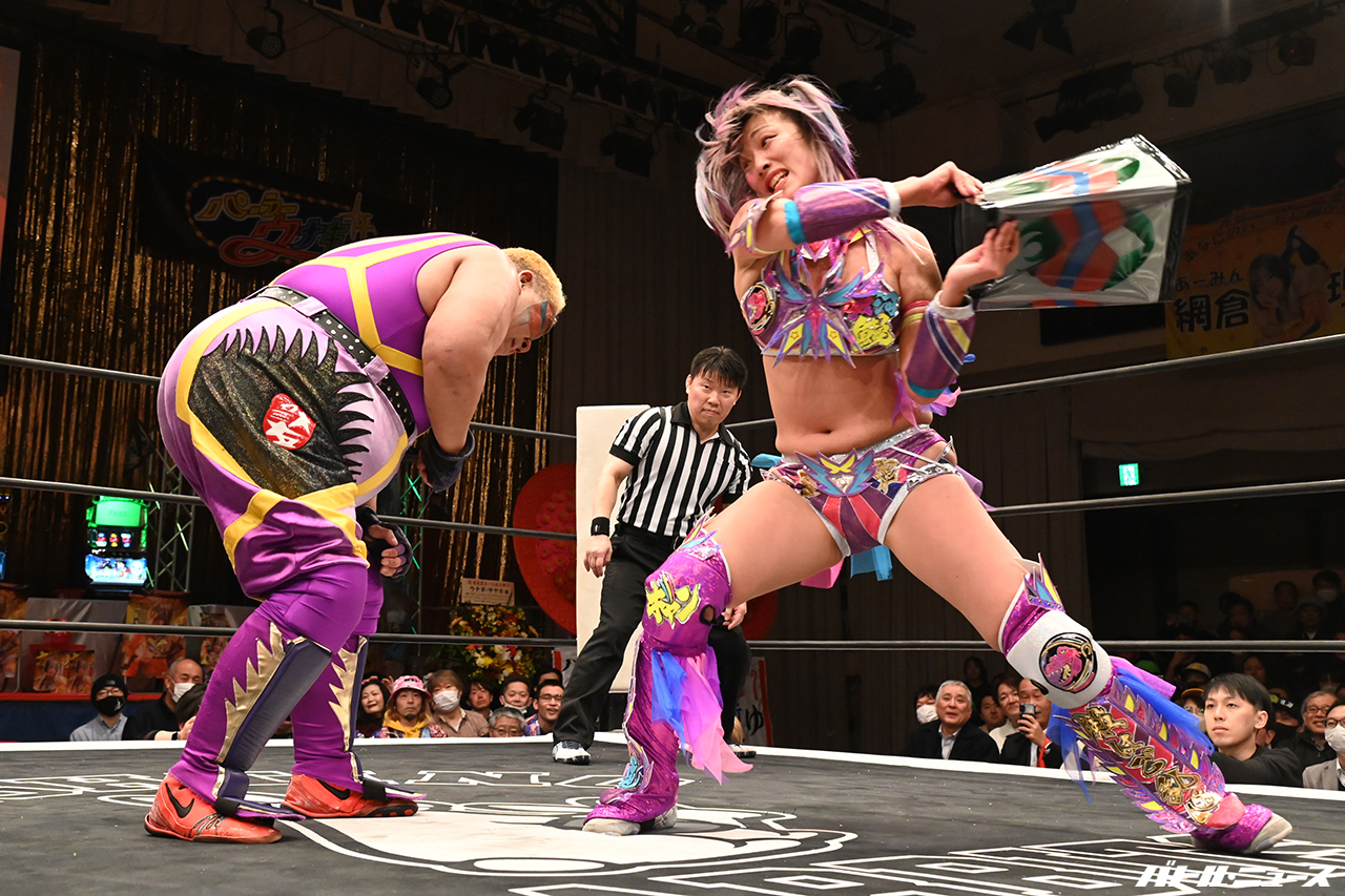 アジャコングがウナギ・サヤカをKOし「お前の歳の数だけプロレスやってるんだ」!デビュー40周年記念沖縄大会でウナギの貝殻ビキニを予告!?