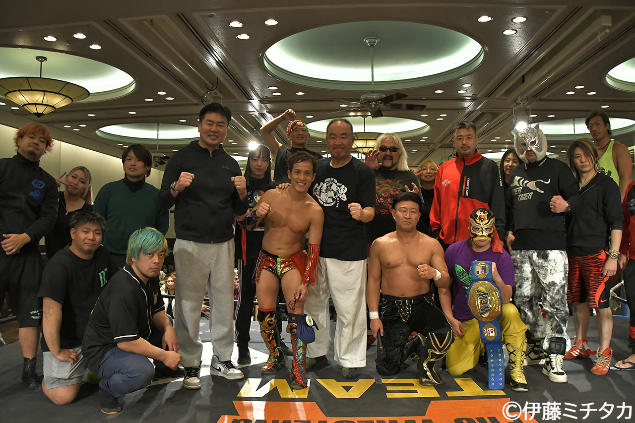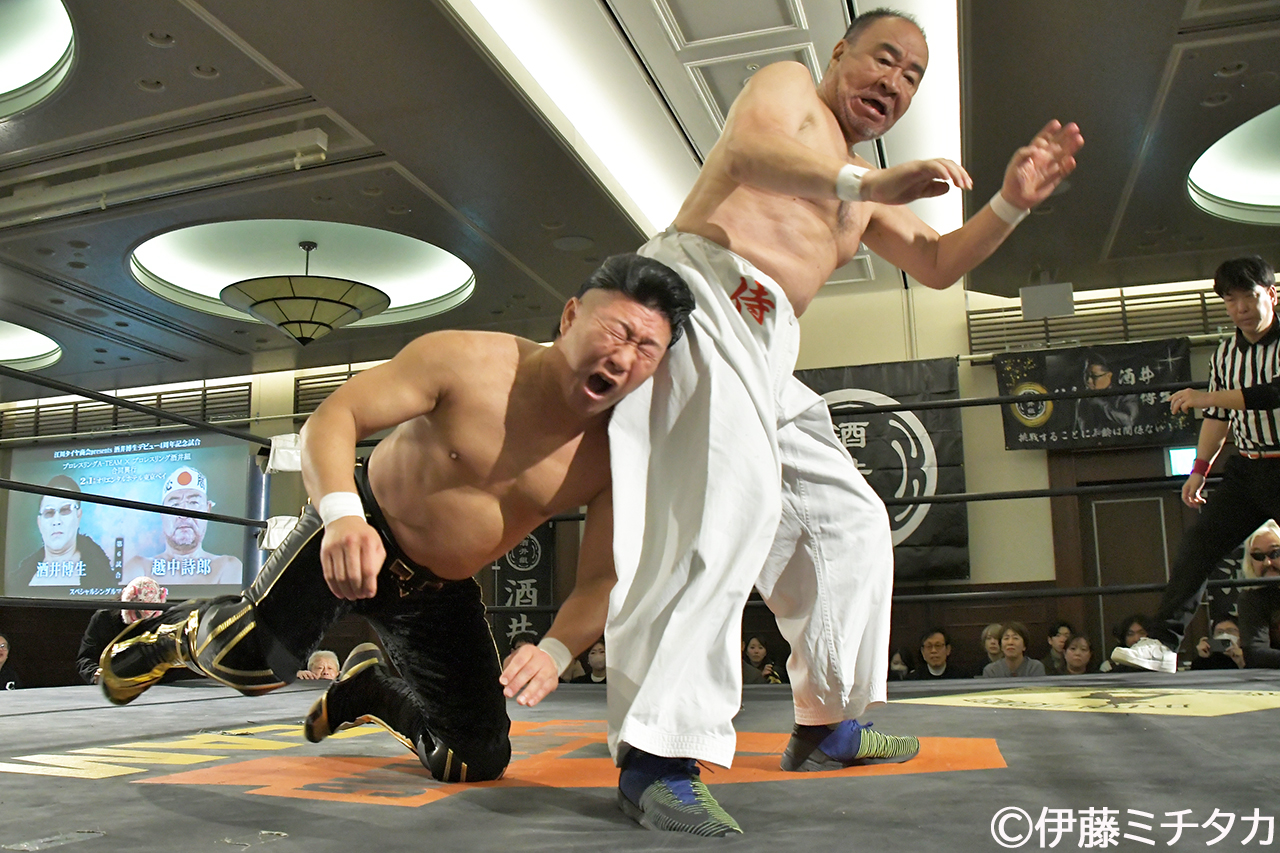 プロレスリングA-TEAMとプロレスリング酒井組が2月1日、千葉・オリエンタルホテル東京ベイ(浦安市)で合同興行『酒井博生デビュー4周年記念大会』を開催した。酒井組組長の酒井博生が記念試合で“レジェンド”越中詩郎に挑み善戦健闘するも玉砕した。