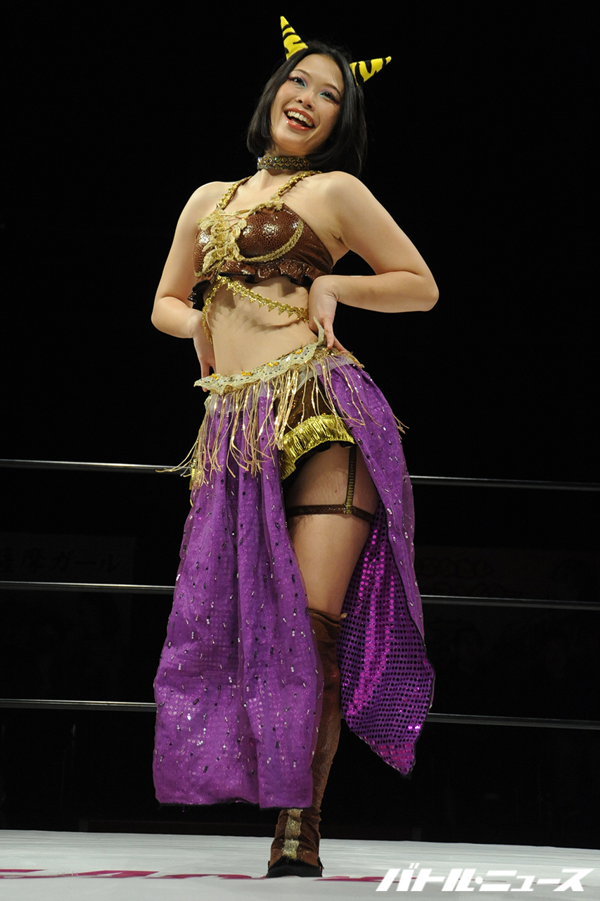 アクトレス5が奇襲し試合開始。なるが頭につけてきた鬼の角のカチューシャをヒナタにつけると、ヒナタはラムちゃんになってアピールするが、なぜかなるは不満そうに蹴りつけてコーナーに振って串刺し攻撃。再度串刺し攻撃を狙うが、ヒナタが逆に振って走り込むも、なるはロープを使ったオーバーヘッドキックから低空ドロップキック。都度都度カチューシャを付け直してさくらにタッチ。