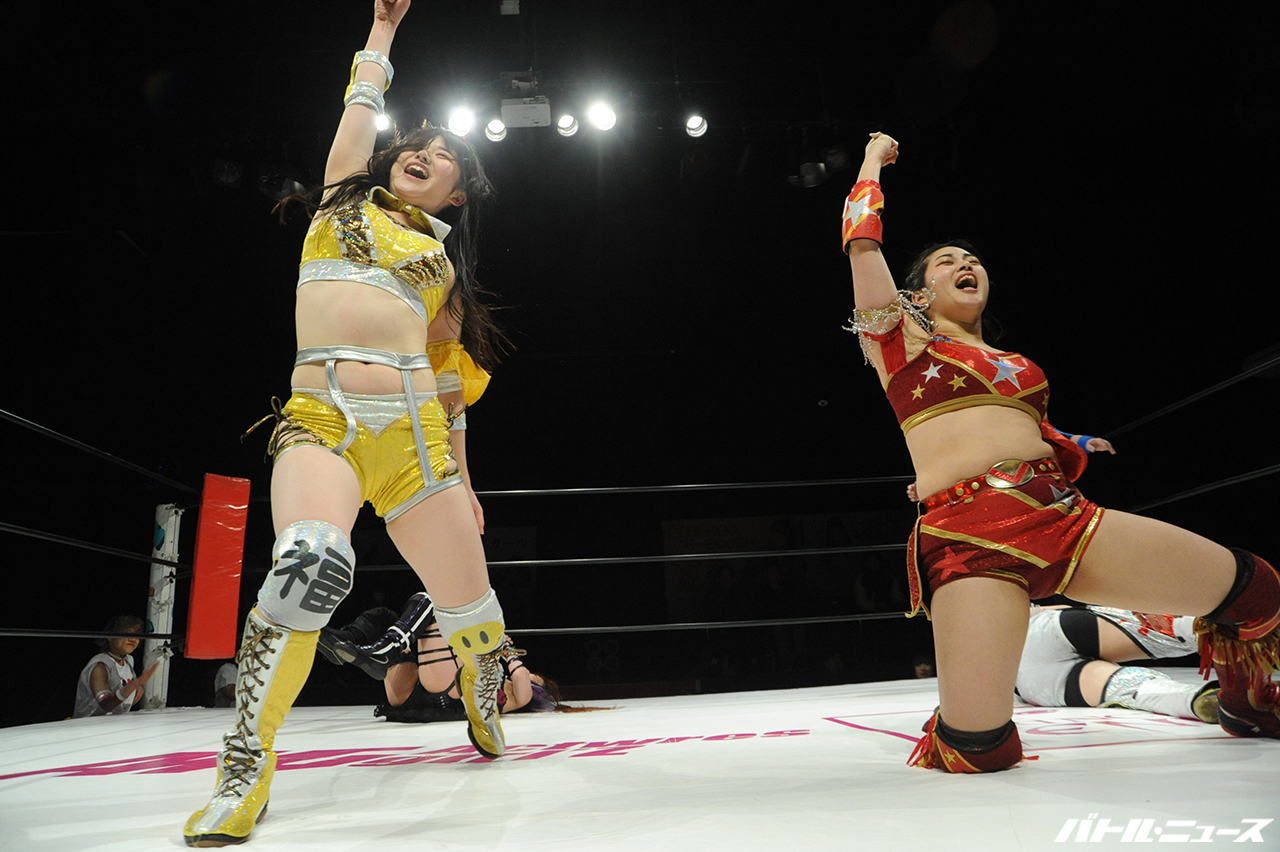 茉莉がなるをサイドバスターで叩きつけ、ヒナタとともにロープに振るが、なるは2人まとめてスピアーで迎撃。さくらがコーナーに登り、ダイビングクロスボディを2人に叩きこむと、なるがヒナタをさくらに振り、さくらが笑顔120%スクールボーイで3カウント。