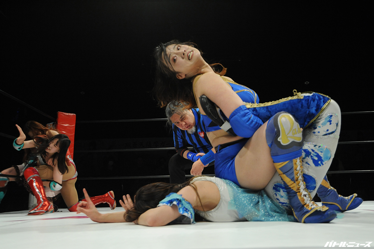 茉莉乃はMARUもバックドロップで投げ捨てるが、MARUはエルボーからバックドロップでお返し。彩乃はかなを担ぐも、暴れたかなが丸め込むも2。
