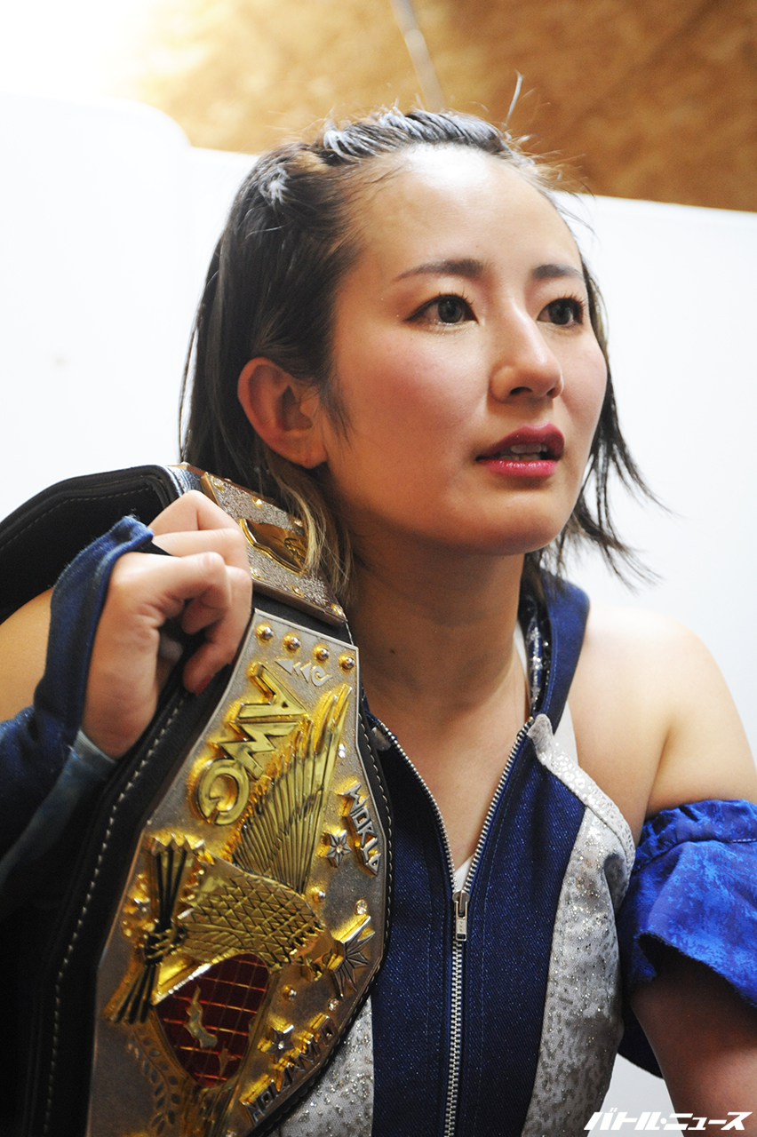 「私がデビューしてから、夏葵ちゃんって結構特別キラキラ輝いてる存在で、私が欠場している時とかも、もうずっと成長をリングの下からも見てて、なんか遠い存在みたいな感じがあったんですね、私からして。まさかそこで同じ位置、今日は私、向こうがチャレンジャーでしたけども、まさかこうやってベルトをかけて闘うところまで自分が来たんだっていうのが結構でかくて、本当に尊敬、努力家だし、真面目だし、もう人としてもすごい尊敬してて、やっぱりそこの、その夏葵と対等に並べたっていうのと、それに今日勝ったっていうのは、私の中でめちゃくちゃでかいですね。うん、なんかずっと超えたかった、超えられるはずないって思ってたのが今日超えれたんで、なんか一歩では大きく進んだ感じがしますね今日は。はい」
