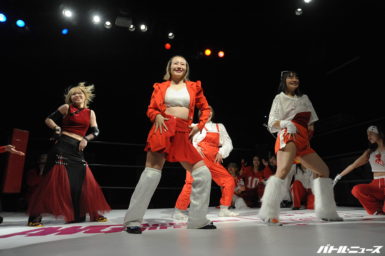 赤と白を基調としたベビーズと、黒と赤を基調としたキラーズがそれぞれダンスを披露し、全員でリングに上がると『Love Riddle』を踊る。間奏ではメインでAWG王座戦を行う夏葵と莉子に加え、この日誕生日の菜々美&絵梨沙の4人がセンターダンスを行った。