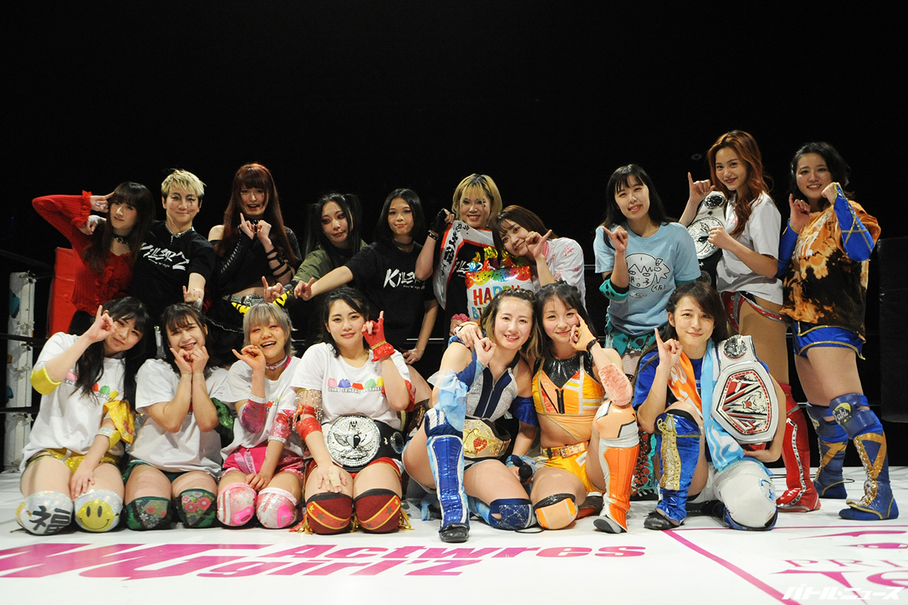 莉子「ありがとう。それでは今日参戦した皆さんリング上がって来てください。今日雪すごかったですね。皆様ほんとにお足元の悪い中ご来場いただきありがとうございました。帰り不安ですよね、車で来た方も気をつけて帰ってください。はい、ぎゅっと。はい、そして、絵梨沙、研!お誕生おめでとう!(バルーン)割らないでねそれ。次回のアクトレスリングは次回2月15日です。是非お越しくださいよろしくお願いします。それでは皆さんいきますよ!強く!優しく!あなたに一生懸命!アクトレス~ガールズ~!!」