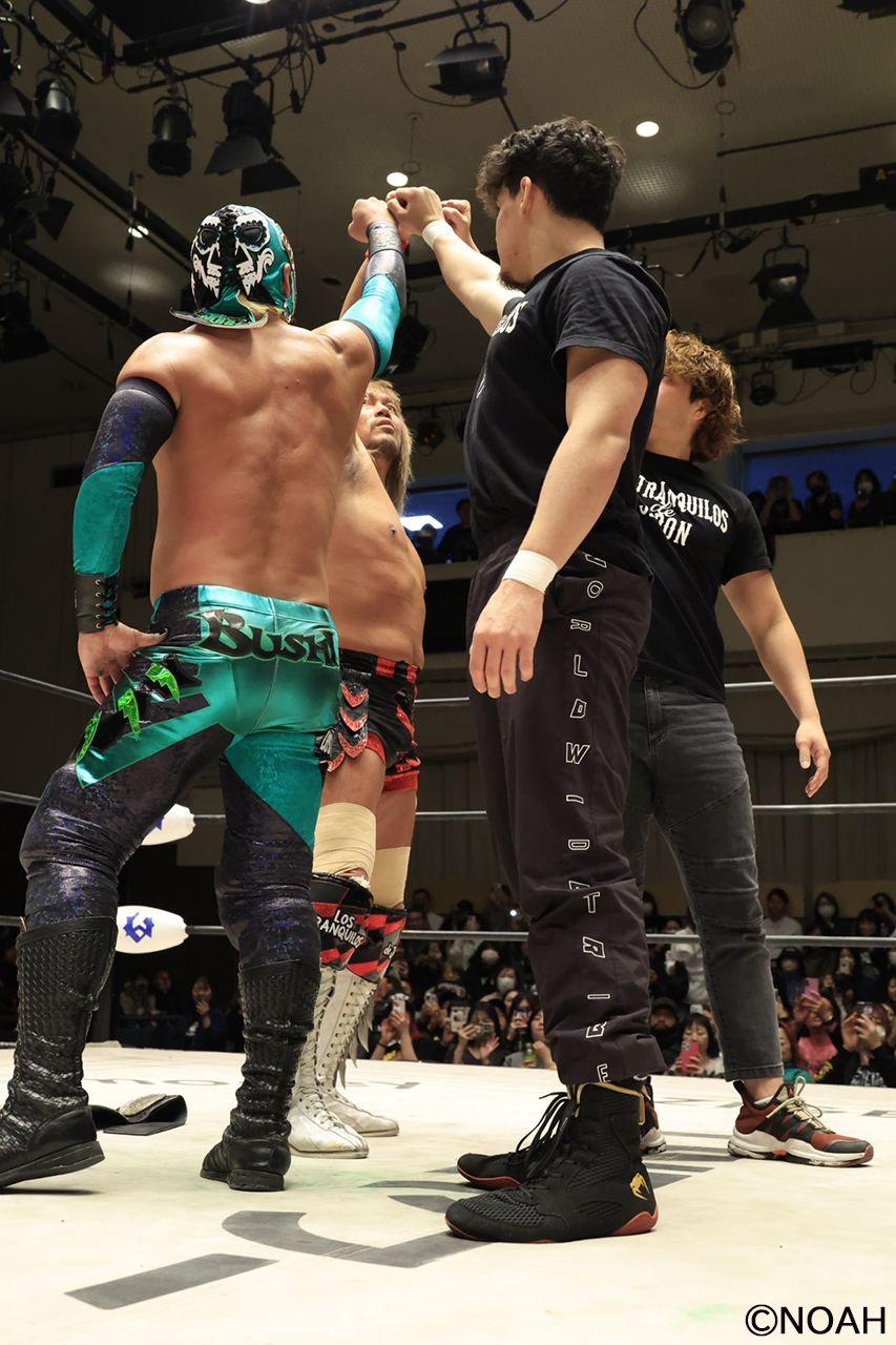 バックステージで内藤は「武道館でこのベルトを獲った時もBUSHI。今日の初防衛戦もBUSHI。パレハだし、同じLOS TRANQUILOS de JAPONのメンバーだけど、すげえ悔しいよ。このプロレスリング・ノアのリングで存在感を示してるBUSHI、俺は物凄く悔しいよ。同じコーナーにいるけどね。悔しい。その悔しい気持ちを持ちながら、またこれから続く戦いに挑んでいきますよ」と対戦相手には言及せず。