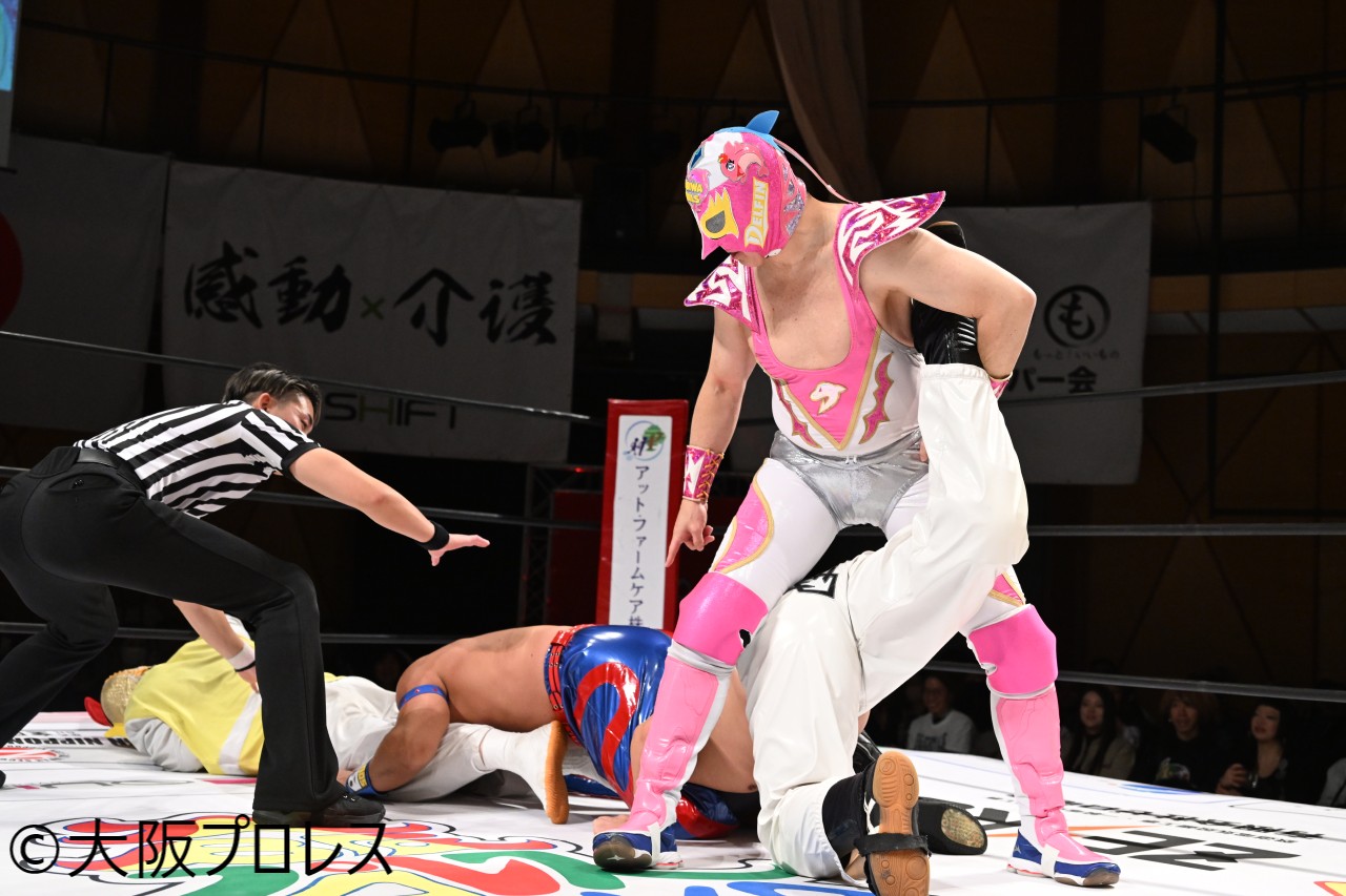 昔懐かしいフェスティバルゲートの薫りが漂うノスタルジックなタッグマッチ。しかしながらこのメンバーではただのリバイバルにあらずそれぞれの持ち味を前面に出してHUBに揺さぶりをかける。キレたHUBが尻尾ムチ攻撃乱れ撃ちで反撃し盛り上がる。そこからは一進一退の攻防が続き、最後は創始者デルフィンのスイングDDTからデルフィンクラッチで盤石の勝利を収めた。