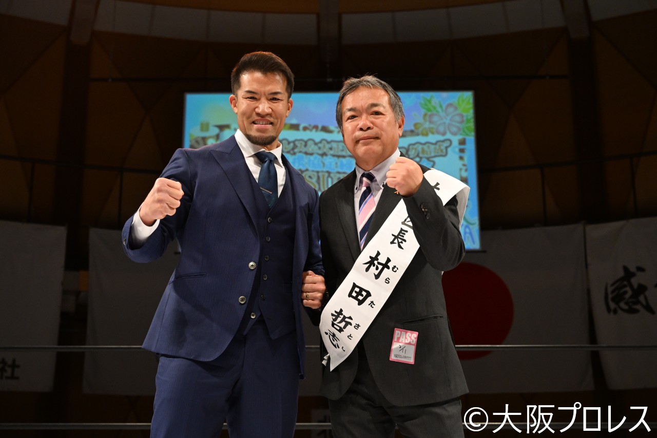 大正区との包括連携締結記念となった本大会のオープニングは大正琉球会の皆様による勇壮なエイサー演舞のあと、ゼウス社長と村田哲志大正区長の最強タッグがリングに上がり包括連携協定締結のご報告を満場の来場者に伝えた。