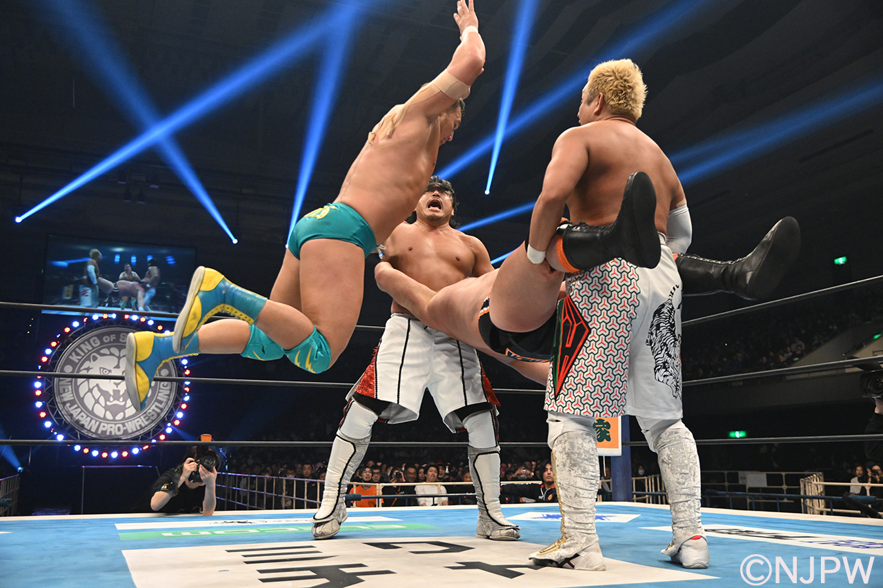 11日、大阪府立体育会館にて新日本プロレス『ミクチャpresents THE NEW BEGINNING in OSAKA』が開催。第3試合では[毘沙門チン]後藤洋央紀&YOSHI-HASHI&ボルチン・オレッグの持つNEVER無差別級6人タッグ王座に[TMDK]ザック・セイバーJr.&大岩陵平&ハートリー・ジャクソンが挑戦した。
