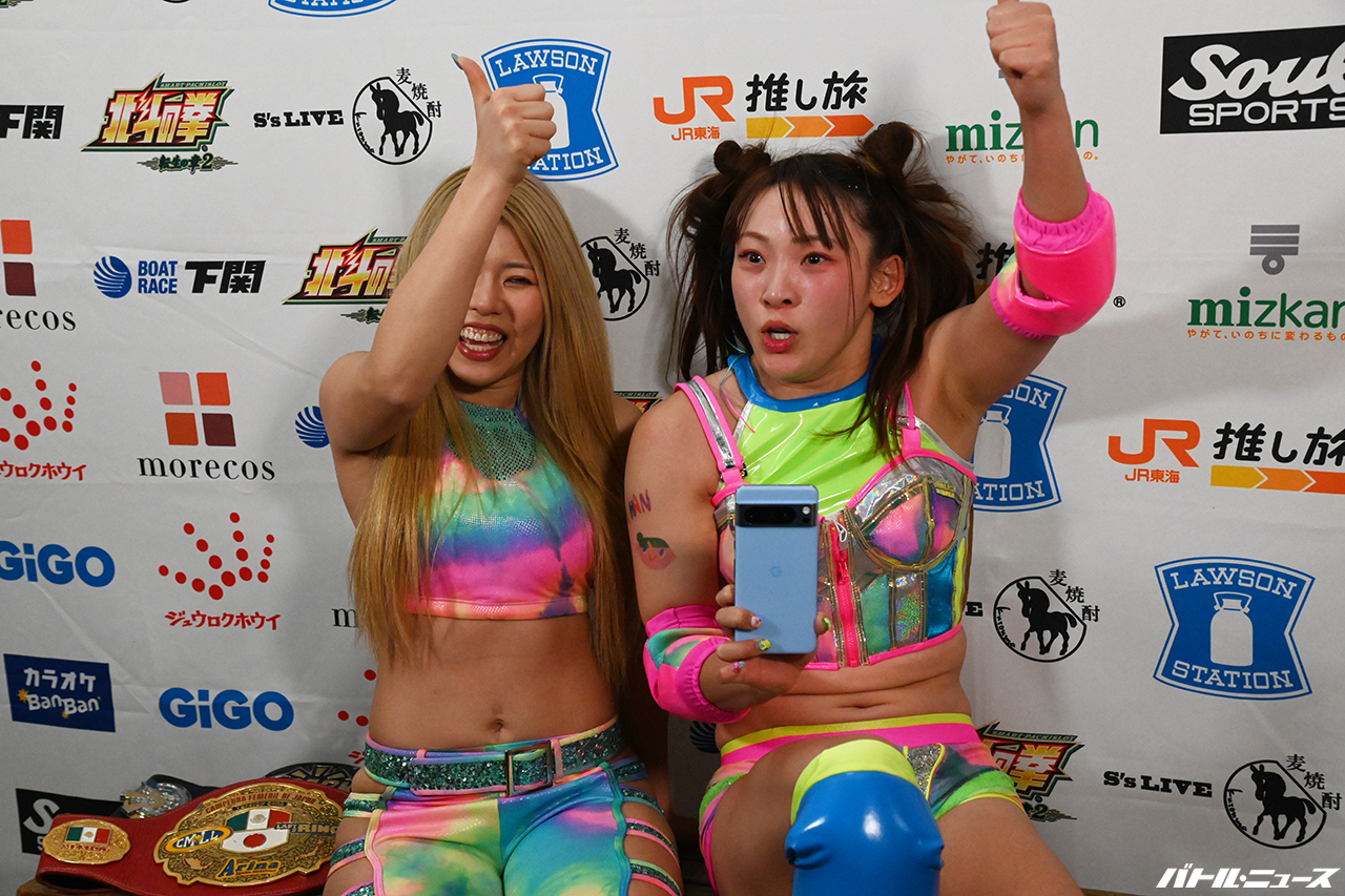 しっかりとした口調で「図にはまだ乗れない状況というのも自覚して、ひとまず嬉しいことは嬉しいけどまだまだここから始まったばかり。これを掴んでここで調子にノッてホップステップジャンプいけたらいいなって。今後の目標としてはやっぱりシングル初勝利っていうのをしっかり狙って、これで図に乗らずに頑張っていけたらいいなと思ってます」と殊勝なコメントを残すが、葉月が「最後聞こえてた?フワコールよりあんねコールが大きくて」と突っ込むと、フワちゃんは「みんな私のタイプをわかってないですね!逆境めちゃ強いですよ私!あんなあんねコールきたらいくぞーって力振り絞りました!」とテンション爆アゲ。さらに「フワちゃんのここ(腰)空いてますよ」と、ベルトへの挑戦もアピールした。