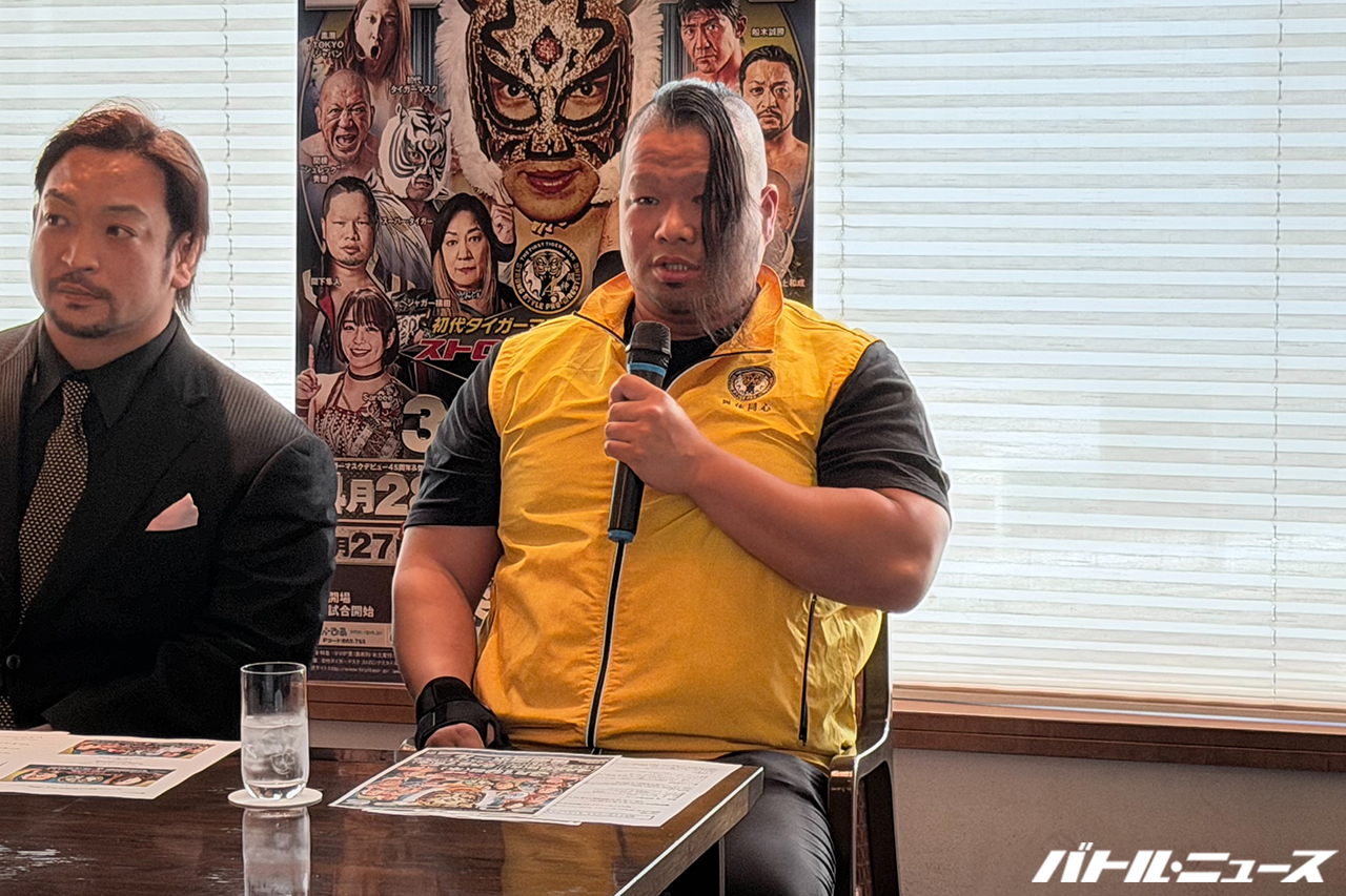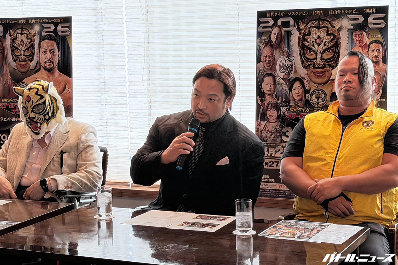 平井代表「皆様、本日も初代タイガーマスク佐山サトル総監が主催いたしますストロングスタイルプロレス記者会見にお越しいただきまして、誠にありがとうございます。昨年も皆様のお力添えと、ファンの皆様のお力添えにより、大変盛り上がることが出来ました。昨年、そして今年は我々にとっても非常に大きな記念すべき年であります。 昨年はストロングスタイルプロレス20周年、盛り上げていただきまして、そして本年2026年は初代タイガーマスク、1981年4月23日、蔵前国技館で佐山総監、タイガーマスクとしてデビューしまして、45周年になります。そして月が明けて5月。佐山サトル総監が新日本プロレス猪木会長の元でデビューをされて、50周年という記念の年になります。この年、皆様と共に、ファンの皆さんと共に、佐山サトル総監、初代タイガーマスク、そしてストロングスタイルプロレス選手一同、駆け抜けていきたいと思います。昨年は4月21日に、佐山総監も尊敬すべき新間会長がご逝去されまして、その新間会長の佐山総監に対する思い、初代タイガーマスク佐山総監に対する思いを、プロレスに対する思い、それを一緒に今年も佐山総監、駆け抜けていく所存であります。よろしくお願いいたします。そして今年は6大会。4月28日には佐山総監の記念すべき、(タイガーマスクとしてデビューした4月)23日の5日後になります。この日は通常の興行とはまた異なり、記念すべき佐山総監をお祝いするイベントを組み立てていく所存であります。3月19日大会、昨年9月、船木誠勝選手を破って第21代レジェンド王者になられました、黒潮TOKYOジャパン。今回、防衛戦を行う相手は最強の挑戦者に、我々は来ていただきました。関本大介選手。うちのレジェンド王座にも2度就いていただいた最強戦士がまた、うちのリングに戻ってくることになりました。この2人の闘い、ぜひ注目いただき、そして前回の大会でタッグ王座、初代王者になりましたスーパータイガー、そして弟弟子であります間下隼人。今回6人タッグで雌雄を決したいと思います。その他、試合も含めよろしくお願いいたします」