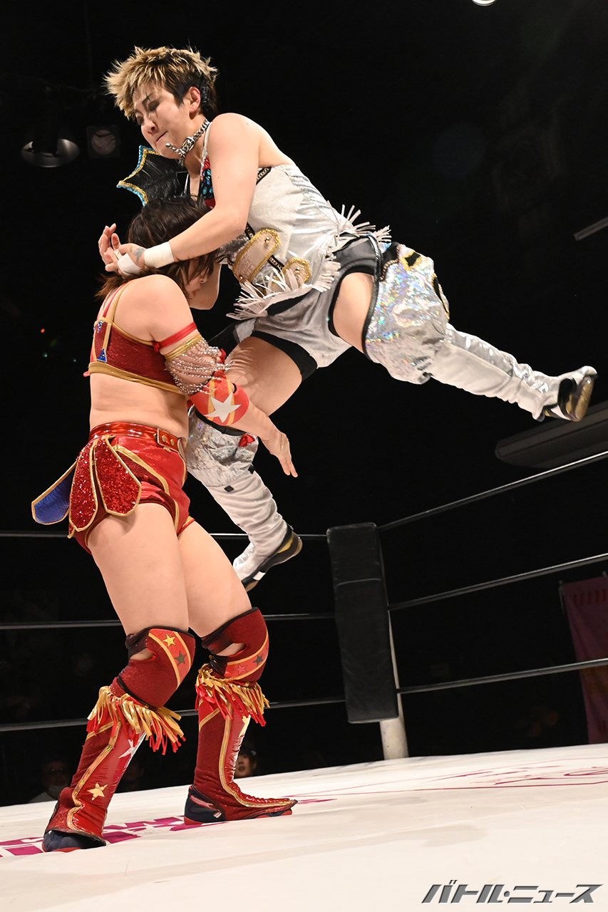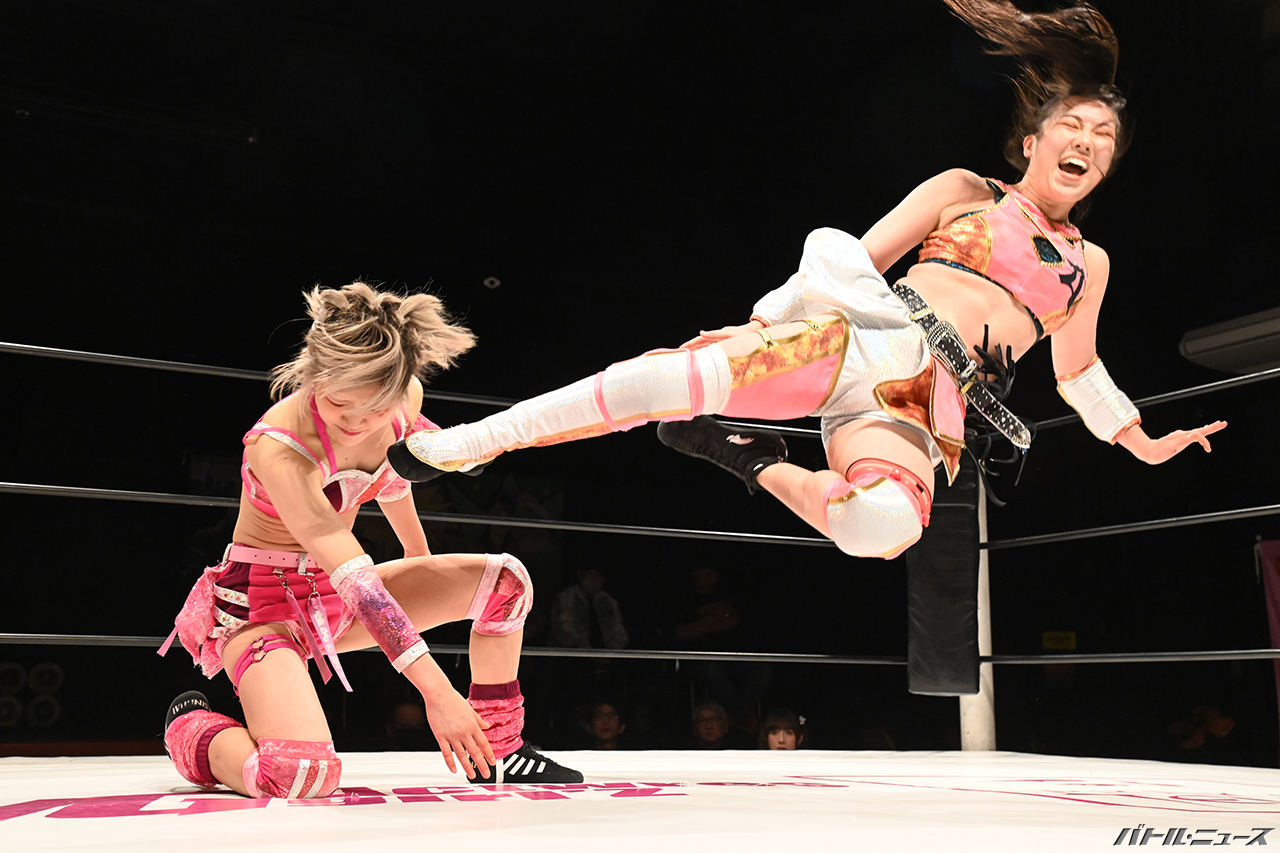 茉莉はソバットからコーナーに振るが、さくらはブーメランクロスボディで迎撃しドロップキック。さらに串刺し攻撃を狙うが茉莉は阿吽で迎撃し、レッグラリアートからフォールも2。