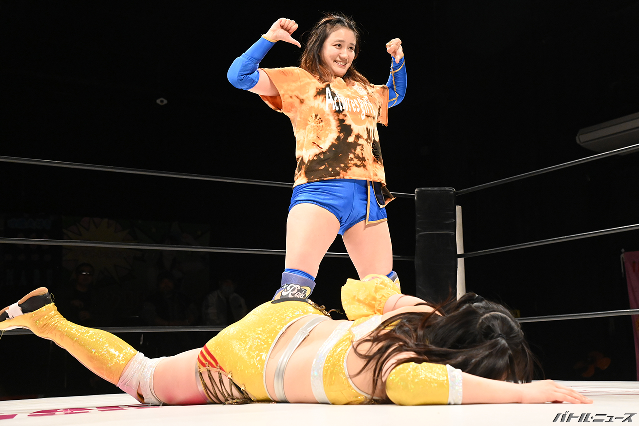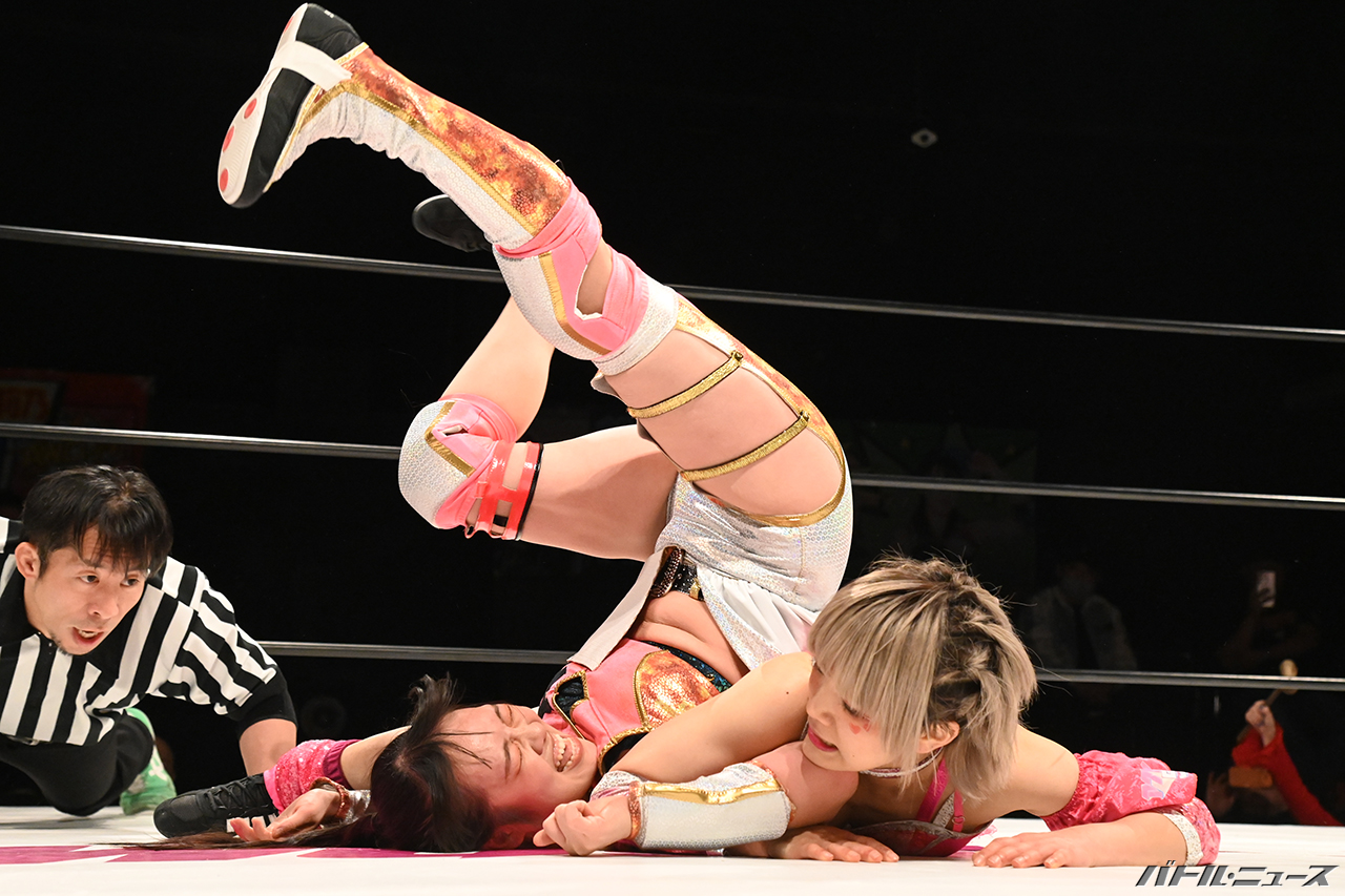 梨央は担ぐが、暴れて着地したかなにチョップを狙うも、かなは腕を巻き込んでヘッドロックから開脚ココナッツクラッシュ。さらに投げようとするが、耐えた梨央が逆に担ごうとするもさくらがカット。