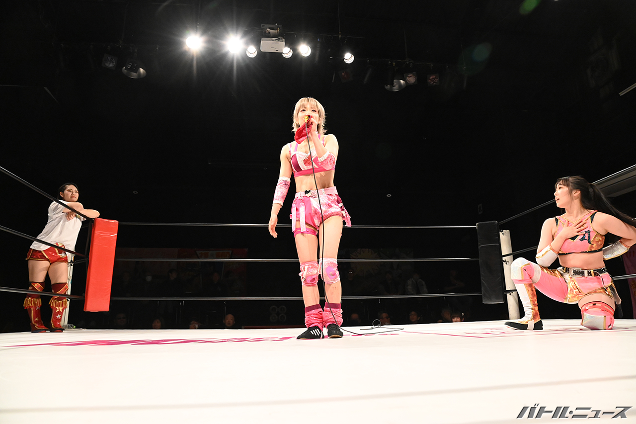 なる「本日はご来場ありがとうございます!まーちゃんが約一ヶ月ぶりの試合で、しかも初シングルでした。どうでした?すごくないですか?すごいよ!それでですね、まーちゃんの記念すべきシングル、初なんですけども、私はここで、皆にちょっとお知らせしたいことがありまして・・・本日、この試合で、アクトレス5のピンクを卒業させていただきます。ちょっとですねあの、私が社長をやってる衣装制作会社がですね、あの~3倍ぐらい忙しくなってしまいまして、ありがたいことに。しかも、そこに、まーちゃんが、アシスタントではいってくれてるんですよ。すごいですよね?しかもデビュー前から!デビュー前から来てくれてるんですよ私の家に。はい。で、デビューして、まーちゃんが、ちょっと私にスタイルが似てるんじゃないかと。闘うスタイルが。思いまして、ピンクを、私の権限でまーちゃんに譲りたいと思います!」