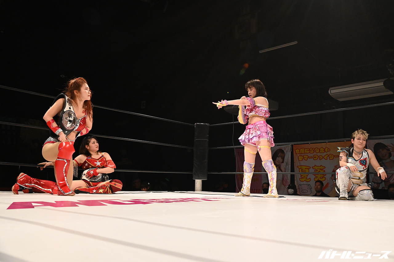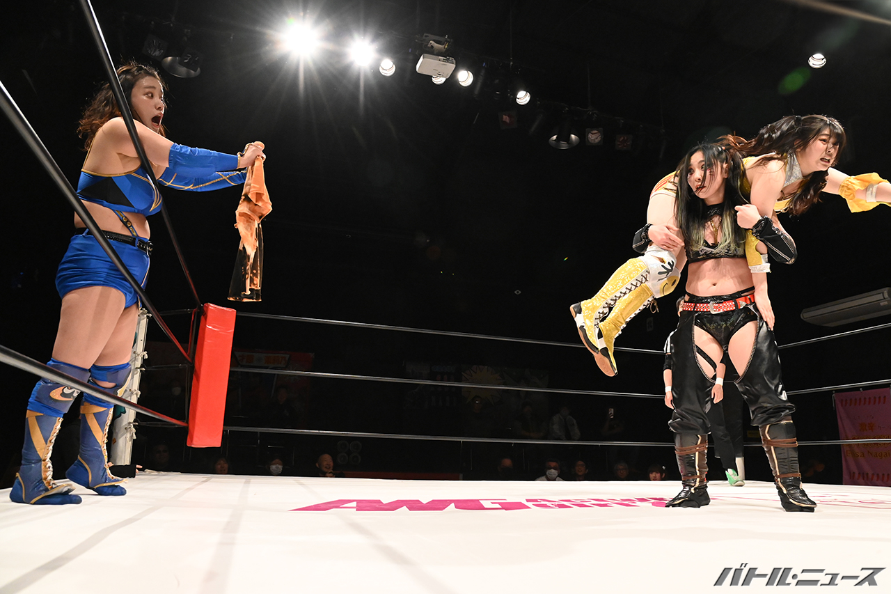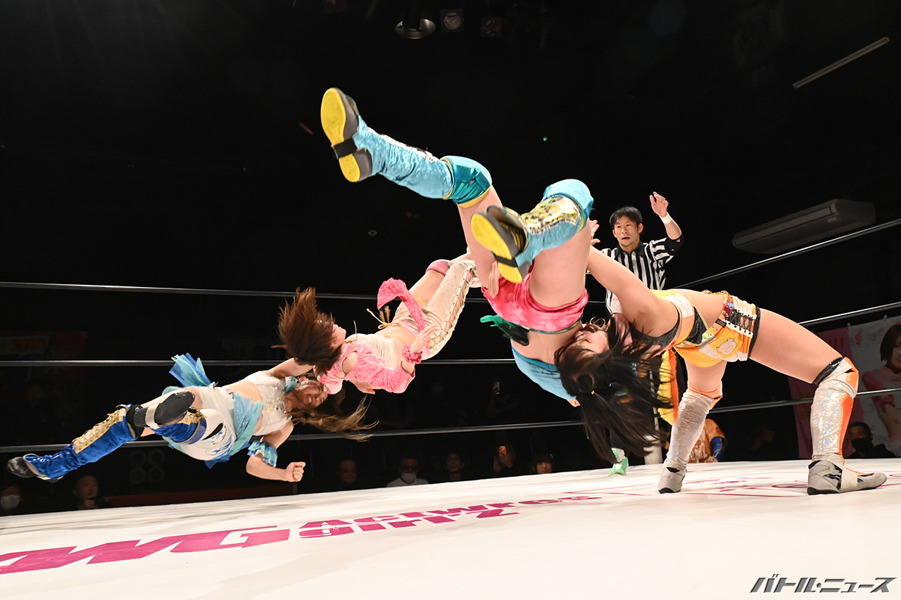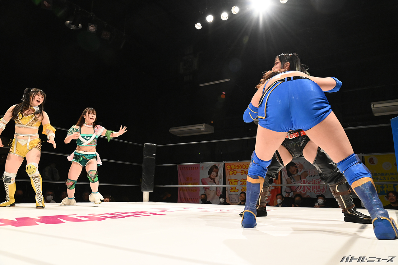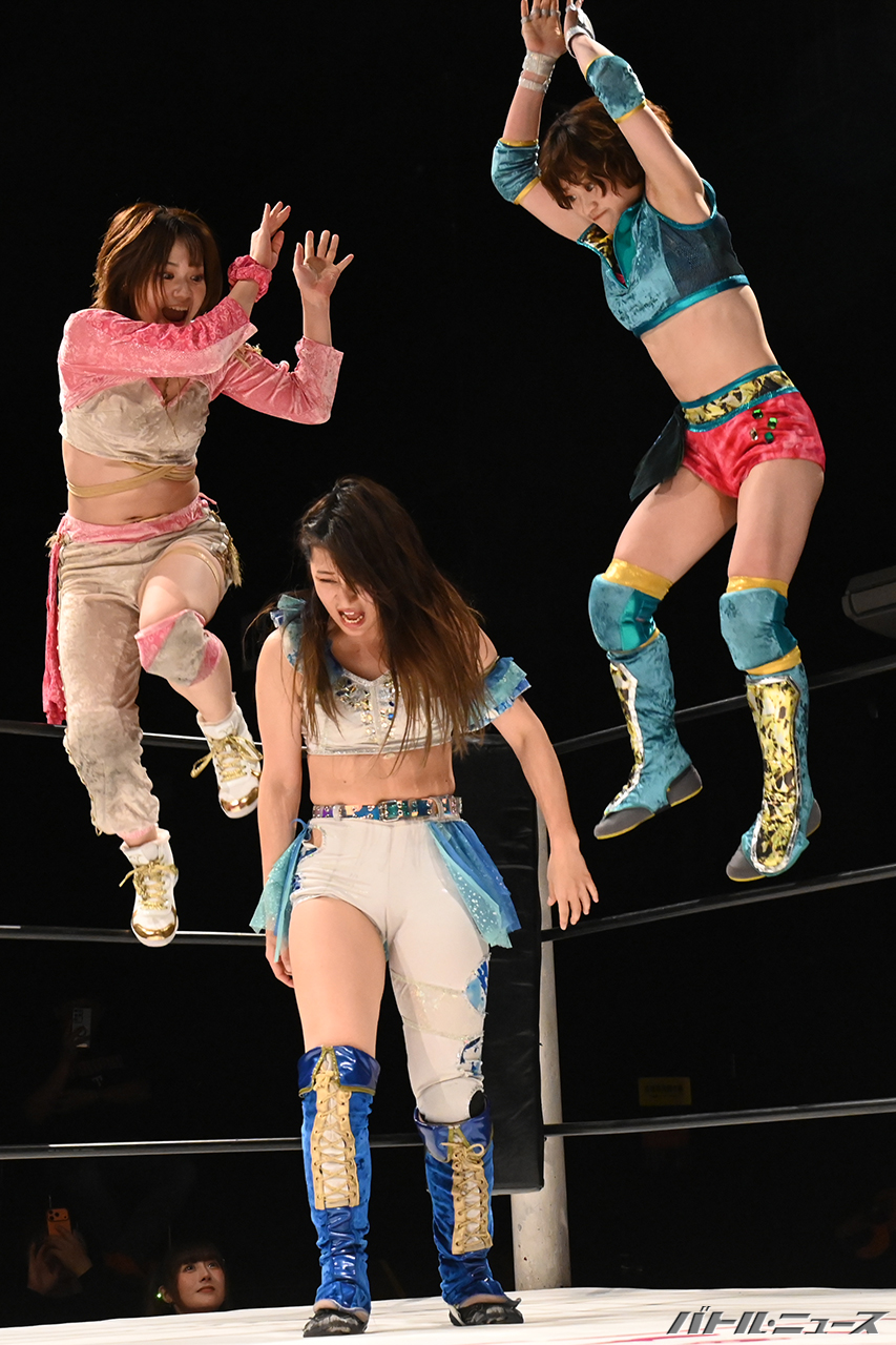ヒナタは莉子を場外に投げ捨て、彩乃をコーナー下にセットするとコーナーに登ろうとするが、莉子がエプロンからエルボー。彩乃がヒナタの背後から蹴りつけ、スタナーからブレイクダウン。さらに極楽固めで捕らえるが莉子がカット。